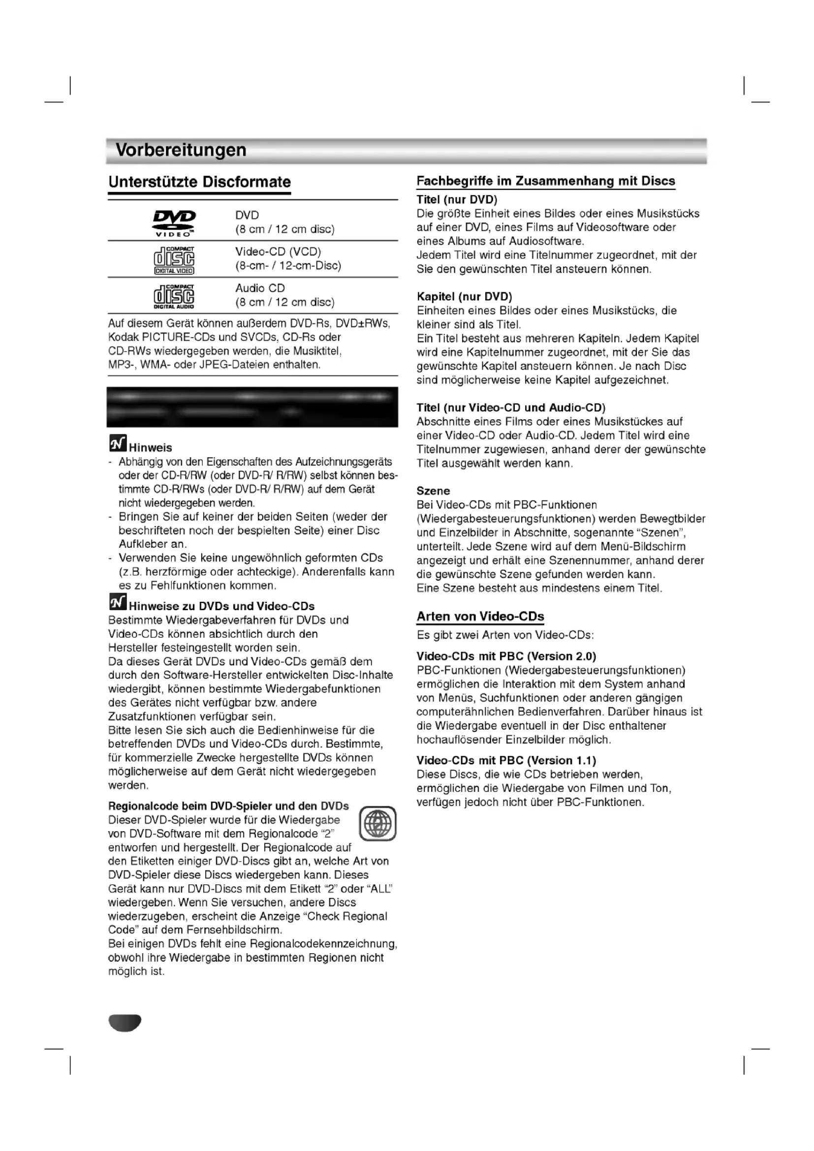 - TechnischeDaten Hinweise den verwendeten Symbolen Zeigt an,dassdieGefahreinesGerateschadensoder anderweitigen Sachschadensbesteht.WeistaufbesondereBetriebsmerkmaledesGeratshin.Weistauf Tipps undTricks hin, die die Bedienung diesesGeratesvereinfachen.4 Vorbereitungen Unterstutzte Discformate DVD (8cm/12cmdisc) Video-CD (VCD) (8-cm- 12-cm-Disc) AudioCD (8cm/12cmdisc) AufdiesemGeratkonnenaußerdem DVD-Rs, DVD±RWs, KodakPICTURE-CDsund SVCDs, CD-RsoderCD-RWs wiedergegeben werden, die Musiktitel, MP3-, WMA-oderJPEG-Dateienenthalten.Hinweis- Abhangig vonden Eigenschaften des Aufzeichnungsgerats oderderCD-R/RW (oder DVD-R/ R/RW) selbstkonnenbes-timmteCD-R/RWs (oder DVD-R/ R/RW) aufdemGeratnicht wiedergegeben werden.- Bringen Sie aufkeinerderbeidenSeiten (weder derbeschriftetennochder bespielten Seite) einerDiscAufkleberan.-VerwendenSiekeine ungewohnlich geformten CDs (z.B. herzformige oder achteckige). Anderenfallskannes zuFehlfunktionenkommen.HinweisezuDVDsundVideo-CDsBestimmte Wiedergabeverfahren furDVDsundVideo-CDskonnenabsichtlichdurchdenHersteller festeingestellt wordensein.DadiesesGeratDVDsundVideo-CDs gemaß demdurchdenSoftware-HerstellerentwickeltenDisc-Inhalte wiedergibt, konnenbestimmte Wiedergabefunktionen desGeratesnicht verfugbar bzw.andereZusatzfunktionen verfugbar sein.BittelesenSiesichauchdieBedienhinweisefurdiebetreffendenDVDsundVideo-CDsdurch. Bestimmte, furkommerzielleZwecke hergestellte DVDskonnen moglicherweise aufdemGeratnicht wiedergegeben werden. Regionalcode beim DVD-Spieler unddenDVDsDieser DVD-Spieler wurdefurdie Wiedergabe vonDVD-Softwaremitdem Regionalcode "2"entworfenund hergestellt. Der Regionalcode aufdenEtiketten einiger DVD-Discs gibt an,welcheArtvon DVD-Spieler diese Discs wiedergeben kann.DiesesGeratkannnurDVD-DiscsmitdemEtikett"2"oder"ALL" wiedergeben. WennSie versuchen, andereDiscs wiederzugeben, erscheintdie Anzeige "Check Regional Code"aufdemFernsehbildschirm.Bei einigen DVDsfehlteine Regionalcodekennzeichnung, obwohlihre Wiedergabe inbestimmten Regionen nicht moglich ist. Fachbegriffe Zusammenhang mitDiscsTitel (nur DVD) Die großte EinheiteinesBildesodereinesMusikstucksaufeiner DVD, einesFilmsaufVideosoftwareodereinesAlbumsaufAudiosoftware.JedemTitelwirdeineTitelnummer zugeordnet, mitderSieden gewunschten Titel ansteuern konnen. Kapitel (nur DVD) EinheiteneinesBildesodereines Musikstucks, diekleinersindalsTitel.EinTitelbestehtausmehreren Kapiteln. Jedem Kapitel wirdeine Kapitelnummer zugeordnet, mitderSiedas gewunschte Kapitel ansteuern konnen.JenachDiscsind moglicherweise keine Kapitel aufgezeichnet. Titel (nur Video-CDund Audio-CD) Abschnitte einesFilmsodereinesMusikstuckesaufeinerVideo-CDoderAudio-CD.JedemTitelwirdeineTitelnummer zugewiesen, anhandderer der gewunschte Titel ausgewahlt werdenkann.SzeneBeiVideo-CDsmitPBC-Funktionen (Wiedergabesteuerungsfunktionen) werden Bewegtbilder undEinzelbilderin Abschnitte, sogenannte "Szenen", unterteilt.JedeSzenewirdaufdemMenu-Bildschirm angezeigt underhalteine Szenennummer, anhanddererdie gewunschte Szene gefunden werdenkann.EineSzenebestehtausmindestenseinemTitel.Arten von Video-CDsEs gibt zweiArtenvonVideo-CDs:Video-CDsmitPBC (Version 2.0) PBC-Funktionen (Wiedergabesteuerungsfunktionen) ermoglichen dieInteraktionmitdem System anhandvon Menus, Suchfunktionenoderanderen gangigen computerahnlichen Bedienverfahren.Daruberhinausistdie Wiedergabe eventuellinderDiscenthaltenerhochauflosenderEinzelbilder moglich. Video-CDsmitPBC (Version 1.1) Diese Discs, diewieCDsbetrieben werden, ermoglichen die Wiedergabe vonFilmenund Ton, verfugen jedoch nichtuberPBC-Funktionen. VideoCDundSVCDstehen nur fur dieModelleDVD6054MundDVD6054 zur Verfugung.5 EINFUHRUNG Vorbereitungen (Fortsetzung) Vorkehrungen UmgangmitdemGeratTransportierendesGeratsBewahrenSiedenOriginalkartonunddieVerpackungsmaterialiengutauf.DasGeratist bestengeschutzt, wenn Sie wieder verpacken,wie ursprunglich vom Werkausgeliefertwurde.AufstellendesGeratsBildundToneinesFernsehgerats,VideorecordersoderRadiosinderNahekonnenwahrendderWiedergabe verzerrt werden.StellenSiediesesGeratindiesemFallweiter vom Fernsehgerat,VideorecorderoderRadioentferntaufoderschaltenSiediesesGeratnachHerausnehmenderDisc aus. ReinigungdesGehausesVerwendenSiekeinefluchtigenLosungsmittelwieInsektenspraysinderNahedesGerates.SorgenSiedafur,dassdasGeratnichtfurlangereZeitmitGummi-oderKunststoffprodukteninKontaktgerat.DiesekonnenSpurenaufdemGehausehinterlassen.SoreinigenSiedasGeratReinigungdesGehausesBenutzenSieeinweichesundtrockenesTuch.Bei extremen VerschmutzungenkonnenSiedasTuchleichtmiteinermildenReinigungslosunganfeuchten.BenutzenSiekeineaggressivenLosungsmittelwiebeispielsweiseAlkohol,BenzinoderVerdunner,dadiesedieOberflachendesGeratesangreifenundbeschadigen.SoerzielenSieeinscharfesBildDieserDVD-SpieleristeinHigh-Tech-Prazisionsgerat.WenndieoptischeAbtastlinseundTeiledesLaufwerksverschmutztoderabgenutztsind,verschlechtertsichdieBildqualitat.EineregelmaßigeWartungundInspektionempfiehltsichjeweilsnach etwa p. 26