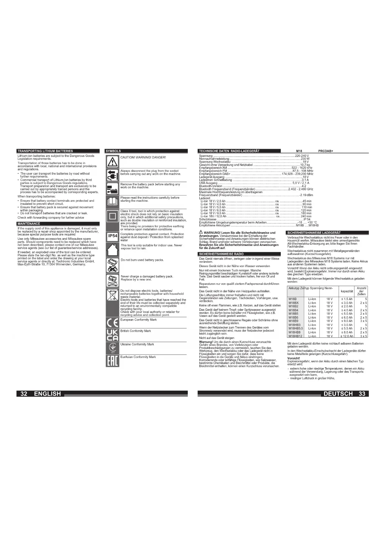 - Beschädigte oder auslaufende Akkus dürfen nicht transportiert werden. Wenden Sie sich für weitere Hinweise an Ihr Speditionsunternehmen. WARTUNG Wenn die Netzanschlussleitung beschädigt ist, muss diese durch eine Milwaukee Kundendienststelle ausgewechselt werden, weil dazu Sonderwerkzeug erforderlich ist. Nur Milwaukee Zubehör und Ersatzteile verwenden. Bauteile, deren Austausch nicht beschrieben wurde, bei einer Milwaukee Kundendienststelle auswechseln lassen (Broschüre Garantie/Kundendienstadressen beachten). Bei Bedarf kann eine Explosionszeichnung des Gerätes unter Angabe der Maschinen Type und der sechsstelligen Nummer auf dem Leistungsschild bei Ihrer Kundendienststelle oder direkt bei Techtronic Industries GmbH, Max-Eyth-Straße 10, 71364 Winnenden, Germany angefordert werden. SYMBOLE ACHTUNG! WARNUNG! GEFAHR! Vor allen Arbeiten an der Maschine den Stecker aus der Steckdose ziehen. Vor allen Arbeiten an der Maschine den Wechselakku herausnehmen Bitte lesen Sie die Gebrauchsanweisung vor Inbetriebnahme sorgfältig durch. Elektrowerkzeug der Schutzklasse II. Elektrowerkzeug, bei dem der Schutz vor einem elektrischen Schlag nicht nur von der Basisisolierung abhängt, sondern auch davon, dass zusätzliche Schutzmaßnahmen, wie doppelte Isolierung oder verstärkte Isolierung, angewendet werden. Es gibt keine Vorrichtung zum Anschluss eines Schutzleiters. IP54 Schutz gegen Kontakt, Staub und Spritzwasser Gerät ist nur zur Verwendung in Räumen geeignet, Gerät nicht dem Regen aussetzen. Wecheselakkus nicht ins Feuer werfen. Keinen beschädigten Wechselakku laden, sondern diesen sofort ersetzen. Elektrogeräte, Batterien/Akkus dürfen nicht zusammen mit dem Hausmüll entsorgt werden. Elektrische Geräte und Akkus sind getrennt zu sammeln und zur umweltgerechten Entsorgung bei einem Verwertungsbetrieb abzugeben. Erkundigen Sie sich bei den örtlichen Behörden oder bei Ihrem Fachhändler nach Recyclinghöfen und Sammelstellen. Europäisches Konformitätszeichen Britisches Konformitätszeichen Ukrainisches Konformitätszeichen Euroasiatisches Konformitätszeichen DEUTSCH DEUTSCH3736 M18 PRCDAB+ ..................220-240 V .........................230 W ...........................18 V ........................10,7 kg ..............522 - 1620 kHz ...............87,5 - 108 MHz ..174,928 - 239,200 MHz ...........................18 V ..........................3,1 A .............. 5,0 V / 2,1 A