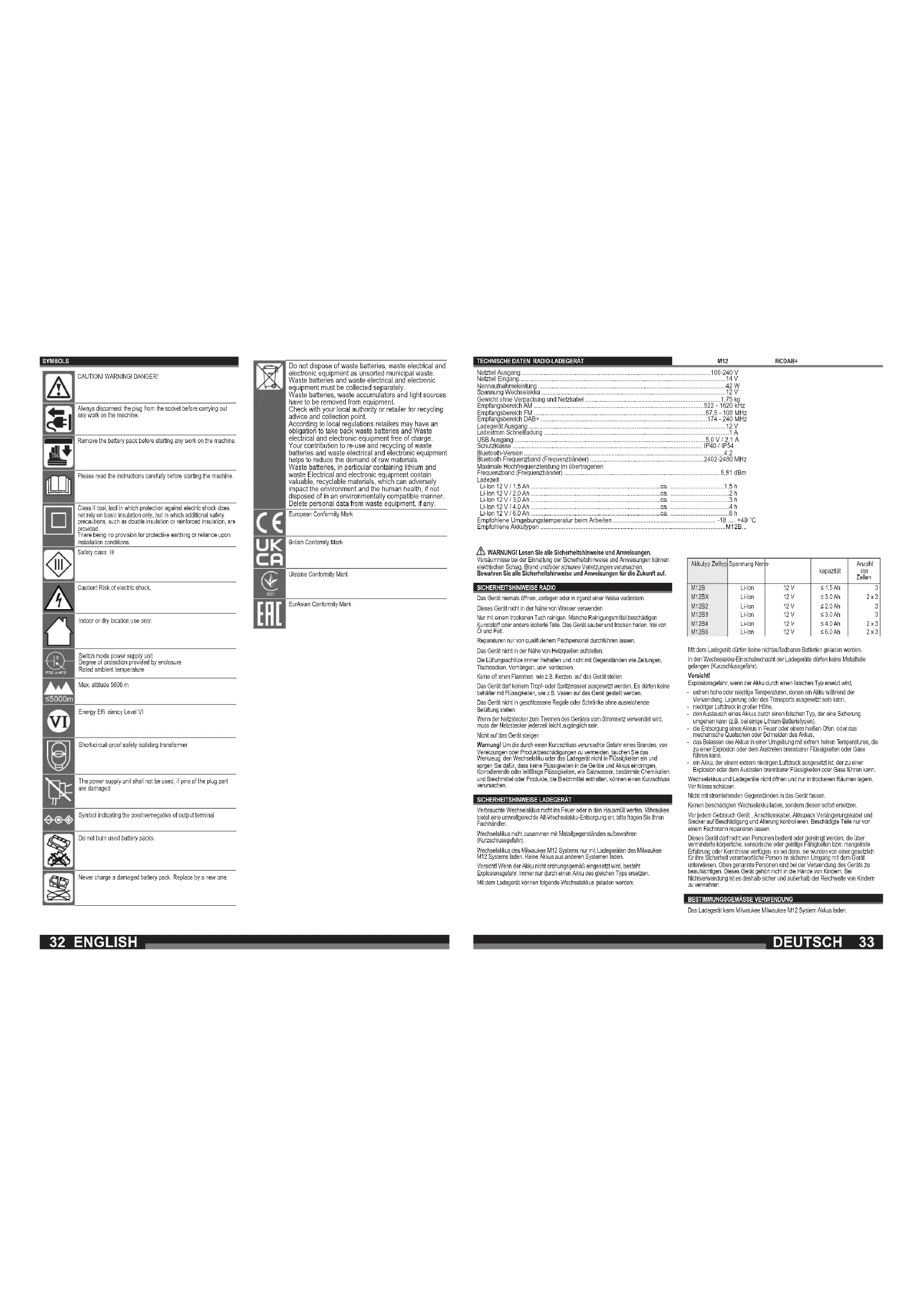 Das Radio nah am Fenster aufstellen, Wände können das Radiosignal dämpfen. Das Radio nicht in der Nähe von störenden Frequenzen aufstellen (Computer, Mikrowellen). Die Antenne in verschiedene Positionen/Richtungen drehen. Die Feldstärkeanzeige erleichtert das Auffi nden einer optimalen Position im Raum bzw. die beste Antenneneinstellung. Hierzu die Taste PRESET so lange drücken, bis in der unteren Zeile die Feldstärke angezeigt wird (siehe Abbildung). Dann das Radio so positionieren, bis möglichst viele Balken der Felstärkeanzeige angezeigt werden. Milwaukee Radio DEUTSCH WARTUNG Wenn die Netzanschlussleitung beschädigt ist, muss diese durch eine Milwaukee Kundendienststelle ausgewechselt werden, weil dazu Sonderwerkzeug erforderlich ist. Nur Milwaukee Zubehör und Ersatzteile verwenden. Bauteile, deren Austausch nicht beschrieben wurde, bei einer Milwaukee Kundendienststelle auswechseln lassen (Broschüre Garantie/Kundendienstadressen beachten). Bei Bedarf kann eine Explosionszeichnung des Gerätes unter Angabe der Maschinen Type und der sechsstelligen Nummer auf dem Leistungsschild bei Ihrer Kundendienststelle oder direkt bei Techtronic Industries GmbH, Max-Eyth-Straße 10, 71364 Winnenden, Germany angefordert werden. SYMBOLE ACHTUNG! WARNUNG! GEFAHR! Vor allen Arbeiten an der Maschine den Stecker aus der Steckdose ziehen. Vor allen Arbeiten an der Maschine den Wechselakku herausnehmen Bitte lesen Sie die Gebrauchsanweisung vor Inbetriebnahme sorgfältig durch. Elektrowerkzeug der Schutzklasse II. Elektrowerkzeug, bei dem der Schutz vor einem elektrischen Schlag nicht nur von der Basisisolierung abhängt, sondern auch davon, dass zusätzliche Schutzmaßnahmen, wie doppelte Isolierung oder verstärkte Isolierung, angewendet werden. Es gibt keine Vorrichtung zum Anschluss eines Schutzleiters. Schutzklasse III Achtung! Stromschlaggefahr. Nur für den Gebrauch in trockenen Innenräumen. IP20 ta:40°C Schaltnetzteil Schutzart durch Gehäuse Bemessungs-Umgebungstemperatur Max. Höhe 5000 m Energieeffi zienz Klasse VI Kurzschlussfester Sicherheitstransformator Das Netzteil darf nicht verwendet werden, wenn die Kontaktstifte des Steckers beschädigt sind. Symbol kennzeichnet den positiven / negativen Ausgangsanschluss Wecheselakkus nicht ins Feuer werfen. Keinen beschädigten Wechselakku laden, sondern diesen sofort ersetzen. Altbatterien, Elektro- und Elektronik-Altgeräte dürfen nicht zusammen mit dem Hausmüll entsorgt werden. Altbatterien, Elektro- und Elektronik-Altgeräte sind getrennt zu sammeln und zu entsorgen. Entfernen Sie Altbatterien, Altakkumulatorn und Leuchtmittel vor dem Entsorgen aus den Geräten. Erkundigen Sie sich bei den örtlichen Behörden oder bei Ihrem Fachhändler nach Recyclinghöfen und Sammelstellen. Je nach den örtlichen Bestimmungen können Einzelhändler verpfl ichtet sein, Altbatterien, Elektro- und Elektronik-Altgeräte kostenlos zurückzunehmen. Tragen Sie durch Wiederverwendung und Recycling Ihrer Altbatterien, Elektro- und Elektronik-Altgeräte dazu bei, den Bedarf an Rohmaterialien zu verringern. Altbatterien (vor allem Lithium-Ionen-Batterien), Elektro- und Elektronik-Altgeräte enthalten wertvolle, wiederverwertbare Materialien, die bei nicht umweltgerechter Entsorgung negative Auswirkungen auf die Umwelt und Ihre Gesundheit haben können. Löschen Sie vor der Entsorgung möglicherweise auf Ihrem Altgerät vorhandene personenbezogene Daten. Europäisches Konformitätszeichen Britisches Konformitätszeichen Ukrainisches Konformitätszeichen Euroasiatisches Konformitätszeichen DEUTSCH3736 M12 RCDAB+ ........................100-240 V .................................14 V .................................42 W .................................12 V ..............................1,75 kg ....................522 - 1620 kHz .....................87,5 - 108 MHz ......................174 - 240 MHz .................................12 V ...................................1 A .....................5,0 V / 2,1 A ................... IP40 / IP54