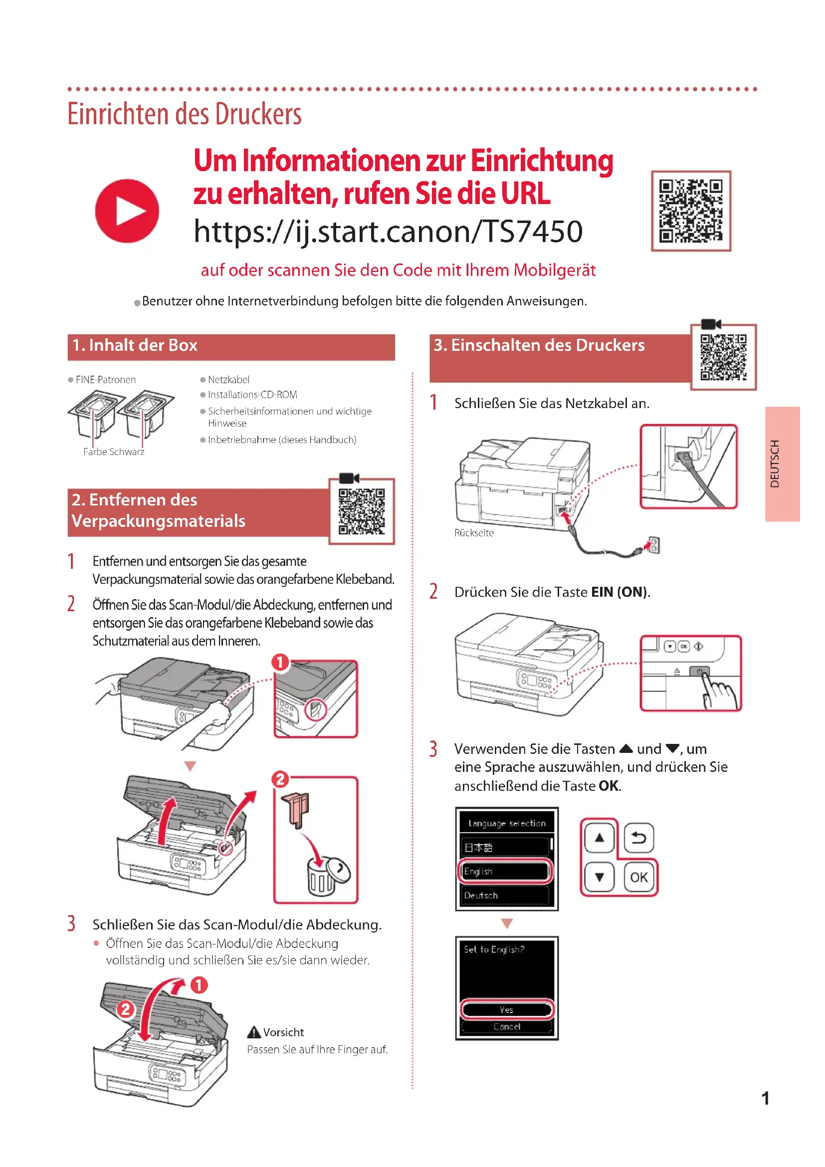 Verwenden Sie die Tasten { und }, um eine Sprache auszuwählen, und drücken Sie anschließend die Taste OK. Um Informationen zur Einrichtung zu erhalten, rufen Sie die URL https://ij.start.canon/TS7450 auf oder scannen Sie den Code mit Ihrem Mobilgerät
