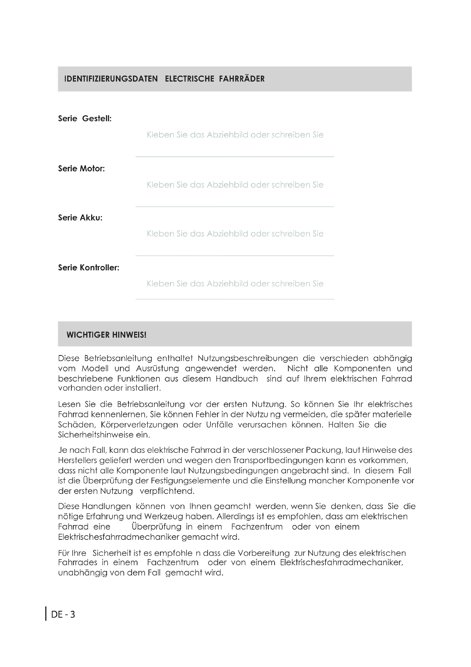 WICHTIGER HINWEIS! Diese Betriebsanleitung enthaltet Nutzungsbeschreibungen die verschieden abhängig vom Modell und Ausrüstung angewendet werden. Nicht alle Komponenten und beschriebene Funktionen aus diesem Handbuch sind auf Ihrem elektrischen Fahrrad vorhanden oder installiert. Lesen Sie die Betriebsanleitung vor der ersten Nutzung. So können Sie Ihr elektrisches Fahrrad kennenlernen, Sie können Fehler in der Nutzu ng vermeiden, die später materielle Schäden, Körperverletzungen oder Unfälle verursachen können. Halten Sie die Sicherheitshinweise ein. Je nach Fall, kann das elektrische Fahrrad in der verschlossener Packung, laut Hinweise des Herstellers geliefert werden und wegen den Transportbedingungen kann es vorkommen, dass nicht alle Komponente laut Nutzungsbedingungen angebracht sind. In diesem Fall ist die Überprüfun g der Festigungselemente und die Einstellung mancher Komponente vor der ersten Nutzung verpflichtend. Diese Handlungen können von Ihnen geamcht werden, wenn Sie denken, dass Sie die nötige Erfahrung und Werkzeug haben. Allerdings ist es empfohlen, dass am elektrischen Fahrrad eine Überprüfung in einem Fachzentrum oder von einem Elektrischesfahrradmechaniker gemacht wird. Für Ihre Sicherheit ist es empfohle n dass die Vorbereitung zur Nutzung des elektrischen Fahrrades in einem Fachzentrum oder von einem Elektrischesfahrradmechaniker, unabhängig von dem Fall gemacht wird.