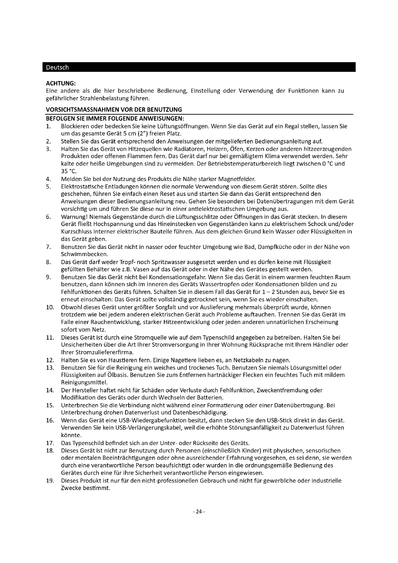 19. Dieses Produkt ist nur für den nicht-professionellen Gebrauch und nicht für gewerbliche oder industrielle