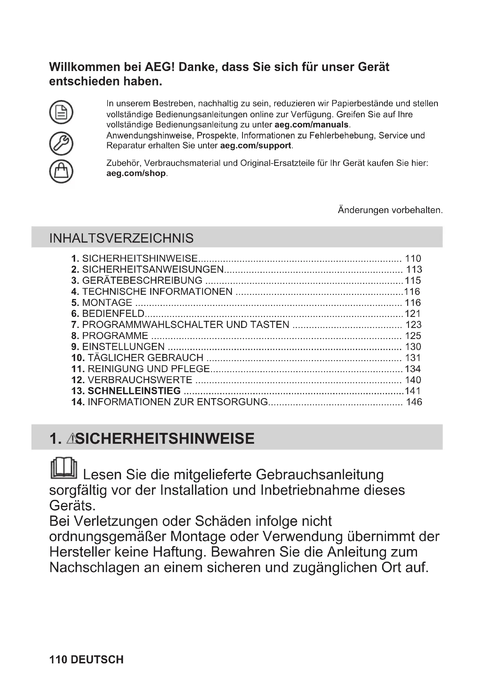 Recyclez les matériaux portant le symbole . Déposez les emballages dans les conteneurs prévus à cet effet. Contribuez à la protection de l'environnement et à votre sécurité, recyclez vos produits électriques et électroniques. Ne jetez pas les appareils portant le symbole avec les ordures ménagères. Emmenez un tel produit dans 108 FRANÇAISvotre centre local de recyclage ou contactez vos services municipaux. Concerne la France uniquement : FRANÇAIS 109Willkommen bei AEG! Danke, dass Sie sich für unser Gerät entschieden haben. In unserem Bestreben, nachhaltig zu sein, reduzieren wir Papierbestände und stellenvollständige Bedienungsanleitungen online zur Verfügung. Greifen Sie auf Ihrevollständige Bedienungsanleitung zu unter aeg.com/manuals.Anwendungshinweise, Prospekte, Informationen zu Fehlerbehebung, Service undReparatur erhalten Sie unter aeg.com/support.Zubehör, Verbrauchsmaterial und Original-Ersatzteile für Ihr Gerät kaufen Sie hier: aeg.com/shop.Änderungen vorbehalten. INHALTSVERZEICHNIS