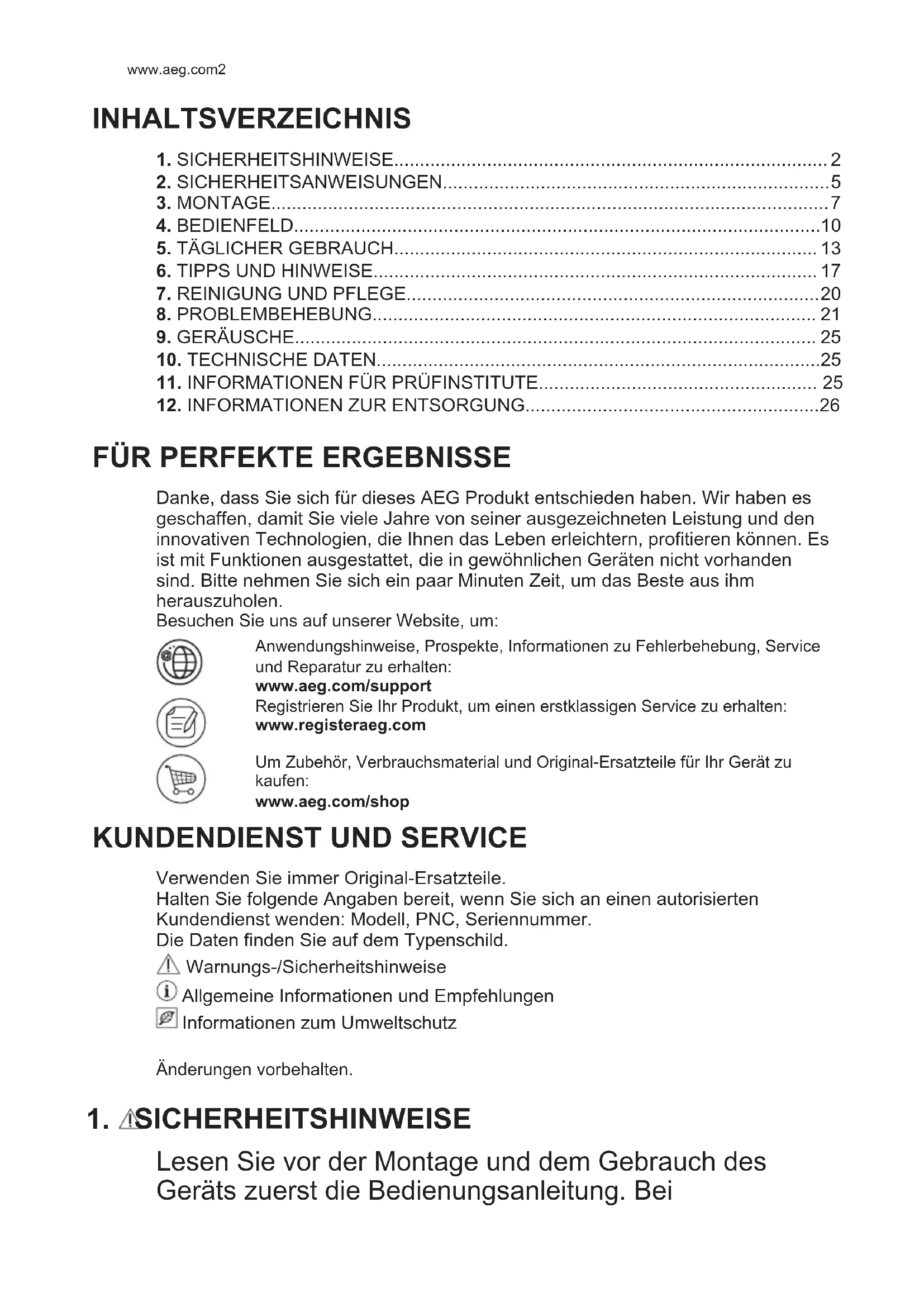 Danke, dass Sie sich für dieses AEG Produkt entschieden haben. Wir haben es geschaffen, damit Sie viele Jahre von seiner ausgezeichneten Leistung und den innovativen Technologien, die Ihnen das Leben erleichtern, profitieren können. Es ist mit Funktionen ausgestattet, die in gewöhnlichen Geräten nicht vorhanden sind. Bitte nehmen Sie sich ein paar Minuten Zeit, um das Beste aus ihm herauszuholen. Besuchen Sie uns auf unserer Website, um: Anwendungshinweise, Prospekte, Informationen zu Fehlerbehebung, Service und Reparatur zu erhalten: www.aeg.com/support Registrieren Sie Ihr Produkt, um einen erstklassigen Service zu erhalten: www.registeraeg.com Um Zubehör, Verbrauchsmaterial und Original-Ersatzteile für Ihr Gerät zu kaufen: www.aeg.com/shop