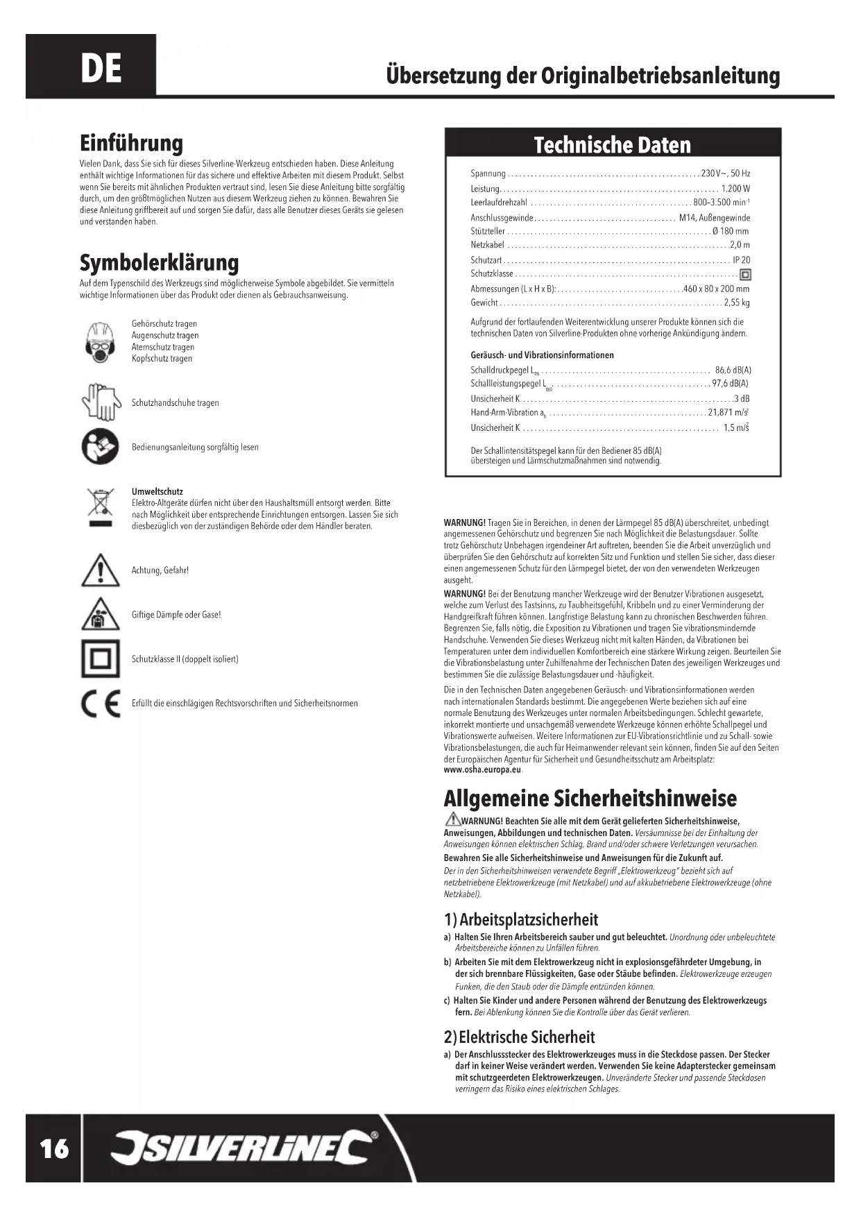 a) Der Anschlussstecker des Elektrowerkzeuges muss in die Steckdose passen. Der Stecker darf in keiner Weise verändert werden. Verwenden Sie keine Adapterstecker gemeinsam mit schutzgeerdeten Elektrowerkzeugen. Unveränderte Stecker und passende Steckdosen verringern das Risiko eines elektrischen Schlages. Übersetzung der Originalbetriebsanleitung Symbolerklärung AufdemTypenschilddesWerkzeugssindmöglicherweiseSymboleabgebildet.SievermittelnwichtigeInformationenüberdasProduktoderdienenalsGebrauchsanweisung.Gehörschutz tragen Augenschutz tragenAtemschutz tragenKopfschutz tragenSchutzhandschuhe tragenBedienungsanleitung sorgfältig lesenUmweltschutz Elektro-AltgerätedürfennichtüberdenHaushaltsmüllentsorgtwerden.BittenachMöglichkeitüberentsprechendeEinrichtungenentsorgen.LassenSiesichdiesbezüglich von der zuständigen Behörde oder dem Händler beraten.Achtung, Gefahr!Giftige Dämpfe oder Gase!SchutzklasseII(doppeltisoliert)Erfüllt die einschlägigen Rechtsvorschriften und Sicherheitsnormen Einführung VielenDank,dassSiesichfürdiesesSilverline-Werkzeugentschiedenhaben.DieseAnleitungenthältwichtigeInformationenfürdassichereundeffektiveArbeitenmitdiesemProdukt.SelbstwennSiebereitsmitähnlichenProduktenvertrautsind,lesenSiedieseAnleitungbittesorgfältigdurch,umdengrößtmöglichenNutzenausdiesemWerkzeugziehenzukönnen.BewahrenSiediese Anleitung griffbereit auf und sorgen Sie dafür, dass alle Benutzer dieses Geräts sie gelesen und verstanden haben.