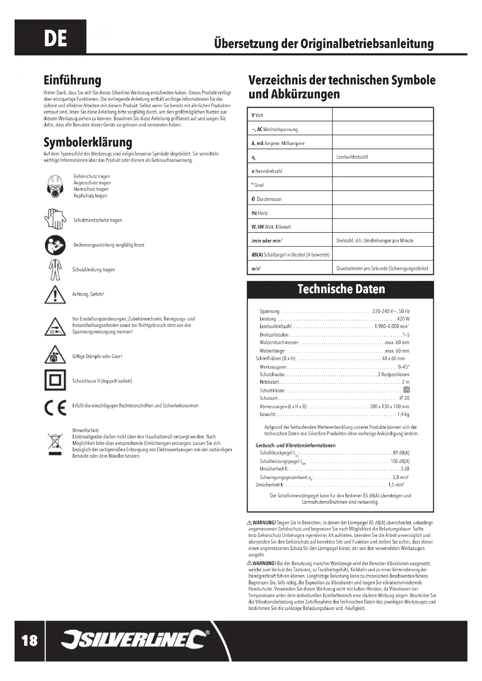Vielen Dank, dass Sie sich für diesen Silverline-Werkzeug entschieden haben. Dieses Produkt verflügt über einzigartige Funktionen. Die vorliegende Anleitung enthalt wichtige Informationen für das sichere und effektive Arbeitsmen mit dieser Produkt. Selfest wenn Sie bereits mit ähnlichen Produkten vertraut sind, lesen Sie diese Anleitungitte sorgfältig durch, um den großmöglichen Nutzen aus dieserwarkzeug ziehen zu denen. Bewahren Sie diese Anleitung griffbereit auf und sorgen sie dazu, dass alle Benutzer these Geräts sie gegeben und verstanden haben.