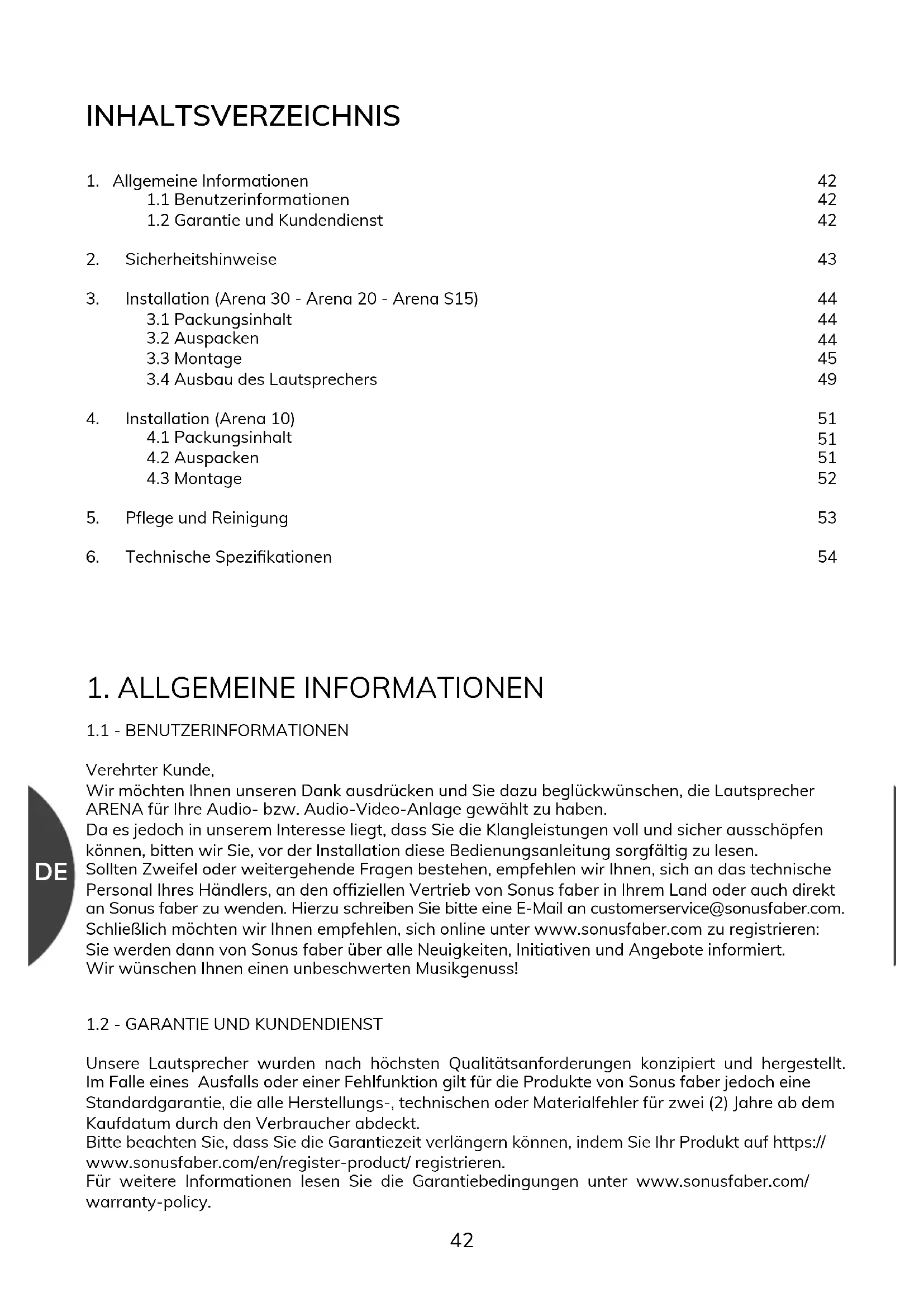 Verehrter Kunde, Wir möchten Ihnen unseren Dank ausdrücken und Sie dazu beglückwünschen, die Lautsprecher ARENA für Ihre Audio- bzw. Audio-Video-Anlage gewählt zu haben. Da es jedoch in unserem Interesse liegt, dass Sie die Klangleistungen voll und sicher ausschöpfen können, bitten wir Sie, vor der Installation diese Bedienungsanleitung sorgfältig zu lesen. Sollten Zweifel oder weitergehende Fragen bestehen, empfehlen wir Ihnen, sich an das technische Personal Ihres Händlers, an den ofziellen Vertrieb von Sonus faber in Ihrem Land oder auch direkt an Sonus faber zu wenden. Hierzu schreiben Sie bitte eine E-Mail an customerservice@sonusfaber.com. Schließlich möchten wir Ihnen empfehlen, sich online unter www.sonusfaber.com zu registrieren: Sie werden dann von Sonus faber über alle Neuigkeiten, Initiativen und Angebote informiert. Wir wünschen Ihnen einen unbeschwerten Musikgenuss!