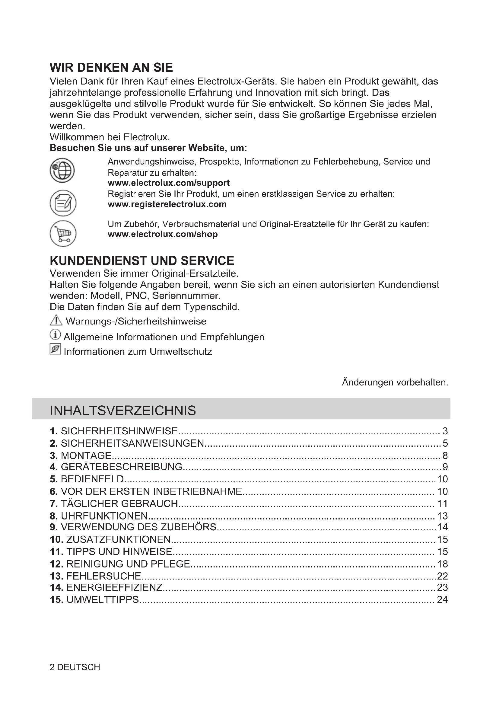 Verwenden Sie immer Original-Ersatzteile. Halten Sie folgende Angaben bereit, wenn Sie sich an einen autorisierten Kundendienst wenden: Modell, PNC, Seriennummer. Die Daten finden Sie auf dem Typenschild. Warnungs-/Sicherheitshinweise Allgemeine Informationen und Empfehlungen Informationen zum Umweltschutz Änderungen vorbehalten. INHALTSVERZEICHNIS