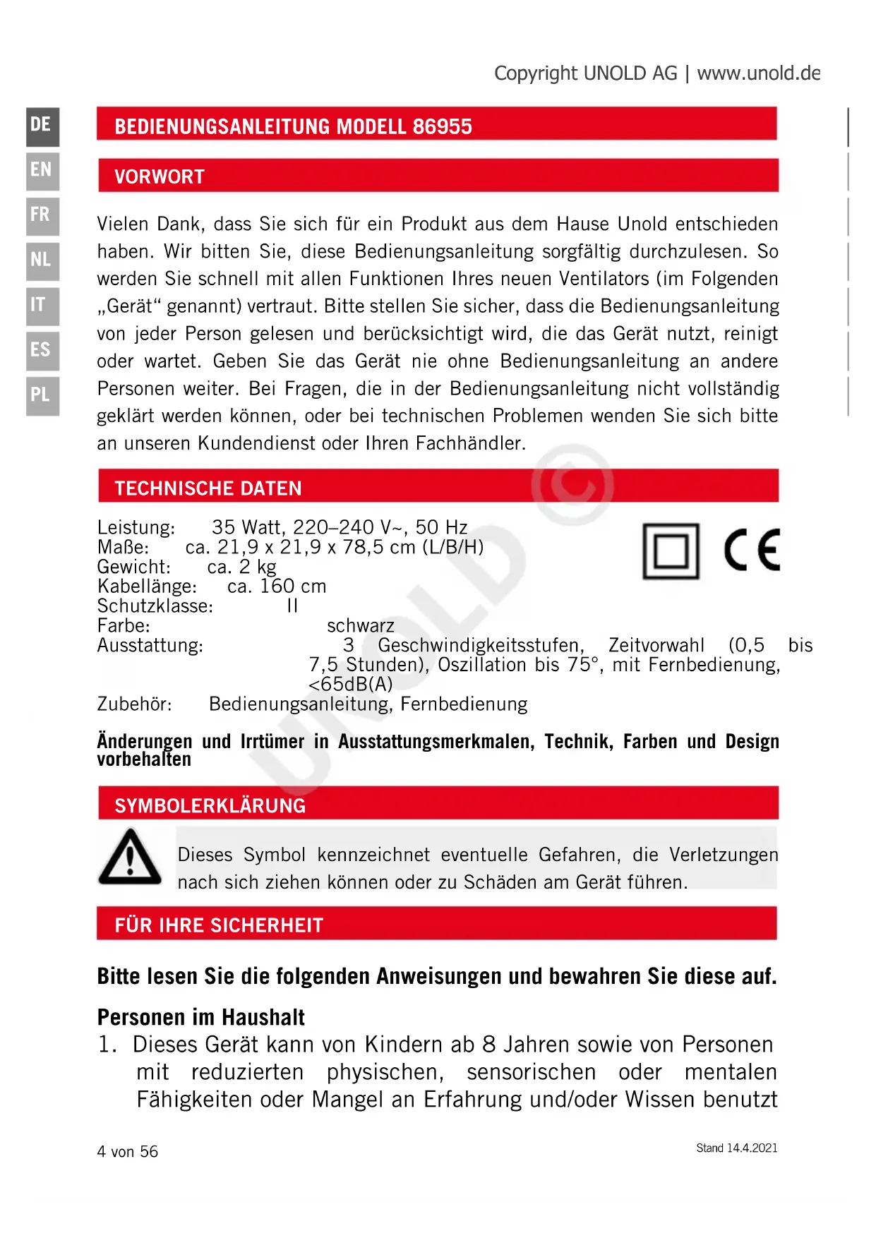 mit reduzierten physischen, sensorischen oder mentalen Fähigkeiten oder Mangel an Erfahrung und/oder Wissen benutzt SYMBOLERKLÄRUNG Dieses Symbol kennzeichnet eventuelle Gefahren, die Verletzungen nach sich ziehen können oder zu Schäden am Gerät führen. VORWORT Vielen Dank, dass Sie sich für ein Produkt aus dem Hause Unold entschieden haben. Wir bitten Sie, diese Bedienungsanleitung sorgfältig durchzulesen. So werden Sie schnell mit allen Funktionen Ihres neuen Ventilators (im Folgenden „Gerät“ genannt) vertraut. Bitte stellen Sie sicher, dass die Bedienungsanleitung von jeder Person gelesen und berücksichtigt wird, die das Gerät nutzt, reinigt oder wartet. Geben Sie das Gerät nie ohne Bedienungsanleitung an andere Personen weiter. Bei Fragen, die in der Bedienungsanleitung nicht vollständig geklärt werden können, oder bei technischen Problemen wenden Sie sich bitte an unseren Kundendienst oder Ihren Fachhändler. Copyright UNOLD AG | www.unold.de UNOLD ©Stand 14.4.2021 5 von 56