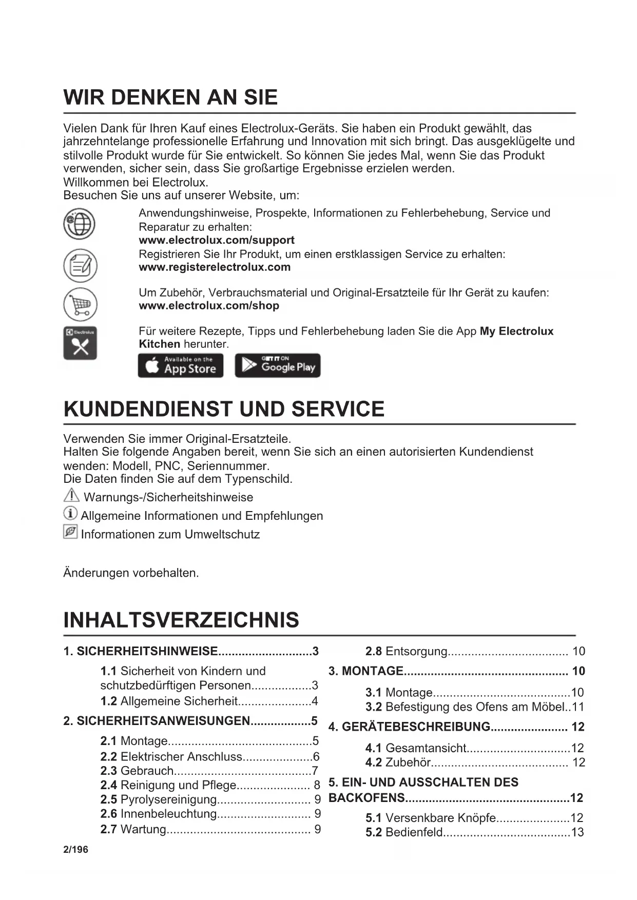 KOMFP46TX DE Backofen Benutzerinformation 2 EN Oven User Manual 41 ES Horno Manual de instrucciones 77 FR Four Notice d'utilisation 116 IT Forno Istruzioni per l’uso 155WIR DENKEN AN SIE Vielen Dank für Ihren Kauf eines Electrolux-Geräts. Sie haben ein Produkt gewählt, das jahrzehntelange professionelle Erfahrung und Innovation mit sich bringt. Das ausgeklügelte und stilvolle Produkt wurde für Sie entwickelt. So können Sie jedes Mal, wenn Sie das Produkt verwenden, sicher sein, dass Sie großartige Ergebnisse erzielen werden. Willkommen bei Electrolux. Besuchen Sie uns auf unserer Website, um: Anwendungshinweise, Prospekte, Informationen zu Fehlerbehebung, Service und Reparatur zu erhalten: www.electrolux.com/support Registrieren Sie Ihr Produkt, um einen erstklassigen Service zu erhalten: www.registerelectrolux.com Um Zubehör, Verbrauchsmaterial und Original-Ersatzteile für Ihr Gerät zu kaufen: www.electrolux.com/shop Für weitere Rezepte, Tipps und Fehlerbehebung laden Sie die App My Electrolux Kitchen herunter.