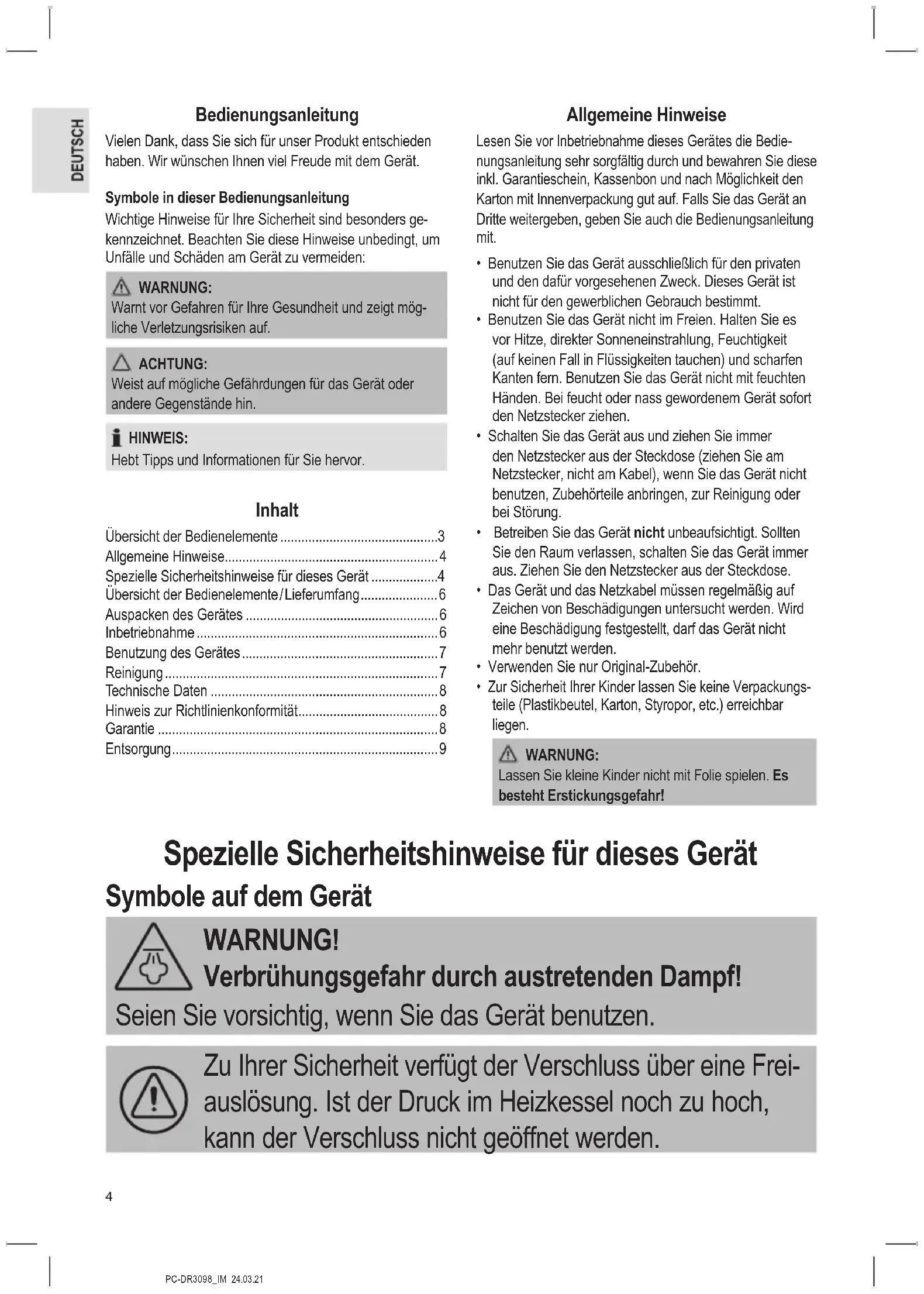 - Zur Sicherheit Ihrer Kinder lassen Sie keine Verpackungs- teile (Plastikbeutel, Karton, Styropor, etc.) erreichbar liegen. WARNUNG: Lassen Sie kleine Kinder nicht mit Folie spielen. Es besteht Erstickungsgefahr! Spezielle Sicherheitshinweise für dieses Gerät Symbole auf dem Gerät WARNUNG! Verbrühungsgefahr durch austretenden Dampf! Seien Sie vorsichtig, wenn Sie das Gerät benutzen. Zu Ihrer Sicherheit verfügt der Verschluss über eine Frei- auslösung. Ist der Druck im Heizkessel noch zu hoch, kann der Verschluss nicht geöffnet werden.5 PC-DR3098_IM 24.03.21 WARNUNG: Verbrennungsgefahr! Fassen Sie die heißen Oberächen nicht an. Wenn Sie Zubehör auswechseln möchten, dann warten Sie, bis das Gerät abgekühlt ist.