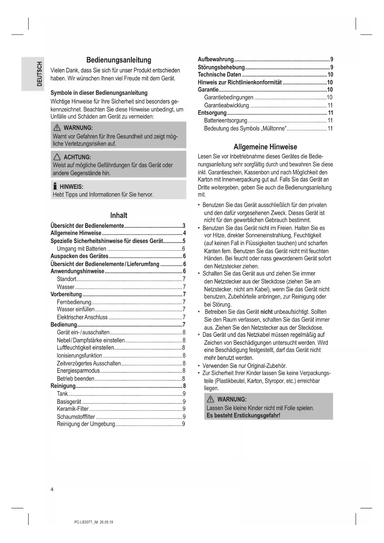 - Zur Sicherheit Ihrer Kinder lassen Sie keine Verpackungs- teile (Plastikbeutel, Karton, Styropor, etc.) erreichbar liegen. WARNUNG: Lassen Sie kleine Kinder nicht mit Folie spielen. Es besteht Erstickungsgefahr!5 PC-LB3077_IM 26.09.19 Spezielle Sicherheitshinweise für dieses Gerät WARNUNG: Trennen Sie das Gerät vom Stromnetz, wenn Sie Wasser nach- füllen oder es reinigen. ACHTUNG: