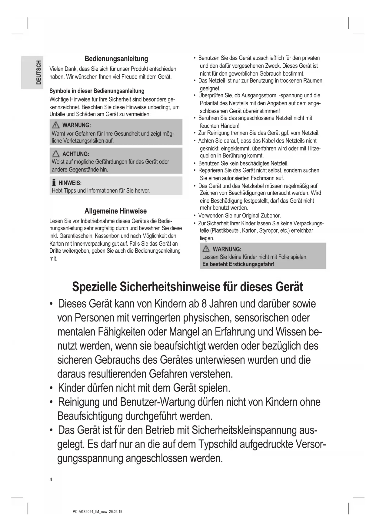 - Das Gerät ist für den Betrieb mit Sicherheitskleinspannung aus- gelegt. Es darf nur an die auf dem Typschild aufgedruckte Versor- gungsspannung angeschlossen werden.5 PC-AKS3034_IM_new 26.08.19