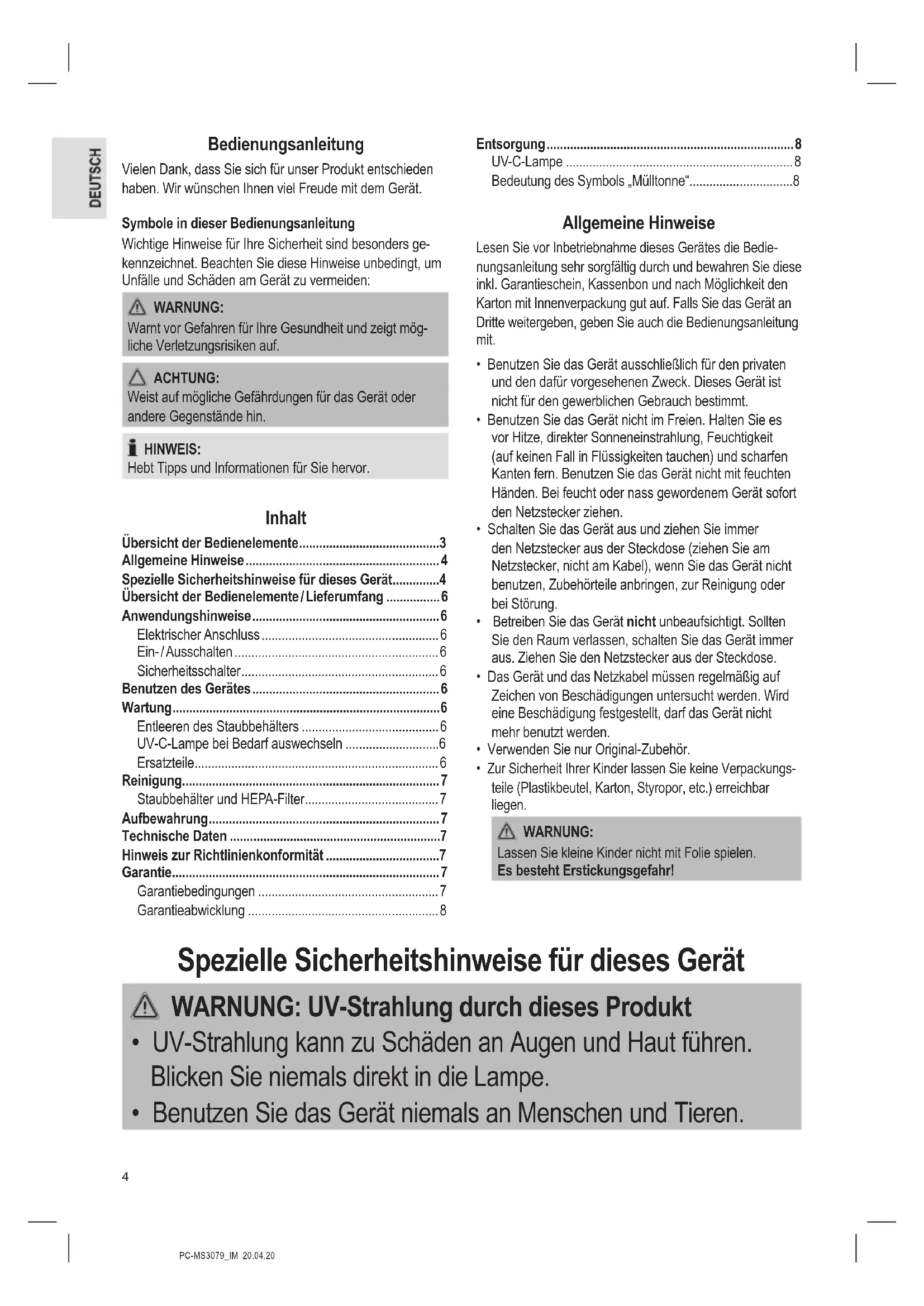 - Benutzen Sie das Gerät niemals an Menschen und Tieren.5 PC-MS3079_IM 20.04.20 WARNUNG: UV-Strahlung durch dieses Produkt