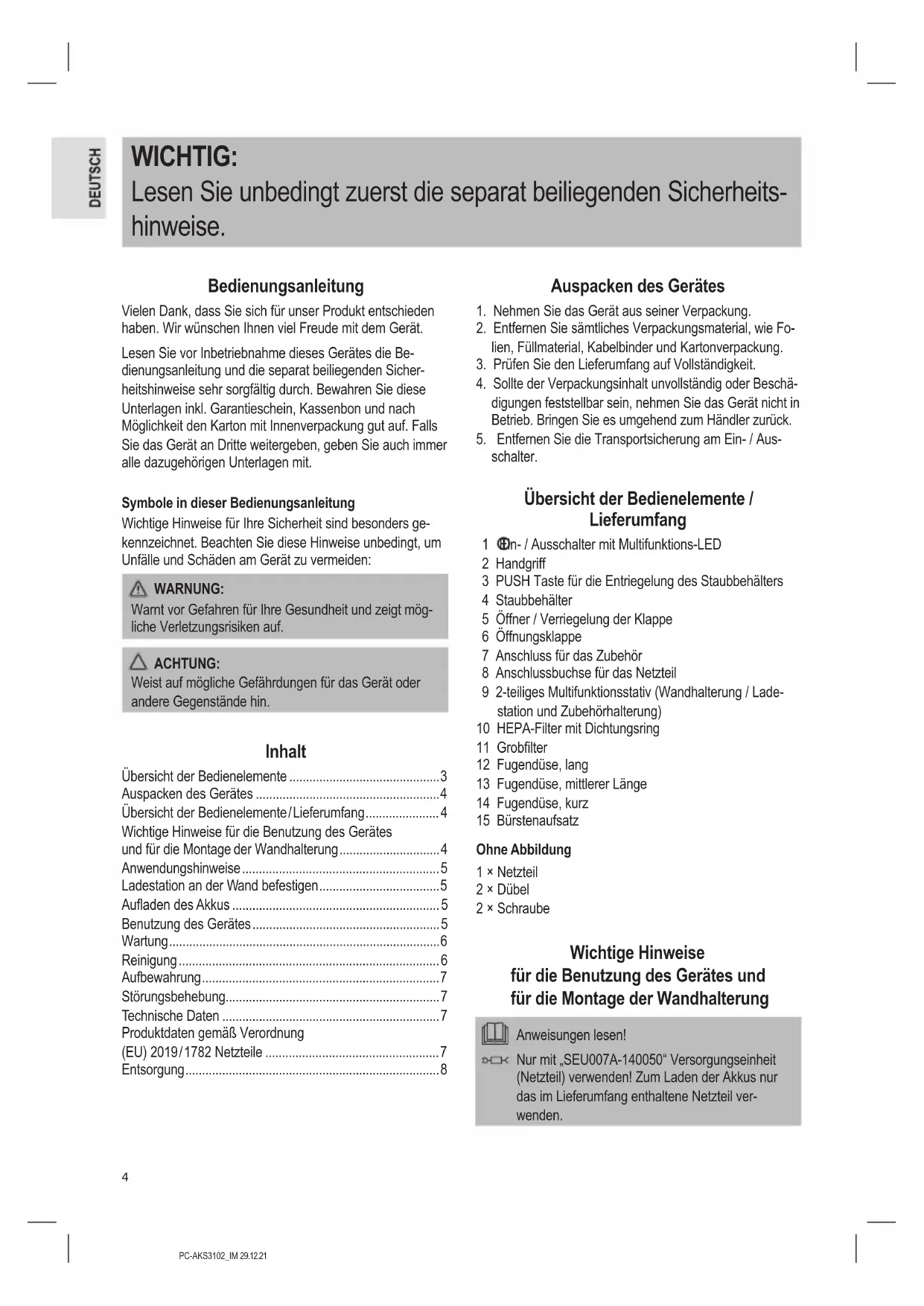schalter. Übersicht der Bedienelemente / Lieferumfang 1 Ein- / Ausschalter mit Multifunktions-LED 2 Handgriff 3 PUSH Taste für die Entriegelung des Staubbehälters 4 Staubbehälter 5 Öffner / Verriegelung der Klappe 6 Öffnungsklappe 7 Anschluss für das Zubehör 8 Anschlussbuchse für das Netzteil 9 2-teiliges Multifunktionsstativ (Wandhalterung / Lade- station und Zubehörhalterung) 10 HEPA-Filter mit Dichtungsring 11 Groblter 12 Fugendüse, lang 13 Fugendüse, mittlerer Länge 14 Fugendüse, kurz 15 Bürstenaufsatz Ohne Abbildung 1 × Netzteil 2 × Dübel 2 × Schraube Wichtige Hinweise für die Benutzung des Gerätes und für die Montage der Wandhalterung Anweisungen lesen! Nur mit „SEU007A-140050“ Versorgungseinheit (Netzteil) verwenden! Zum Laden der Akkus nur das im Lieferumfang enthaltene Netzteil ver- wenden.5 PC-AKS3102_IM 29.12.21 ACHTUNG: