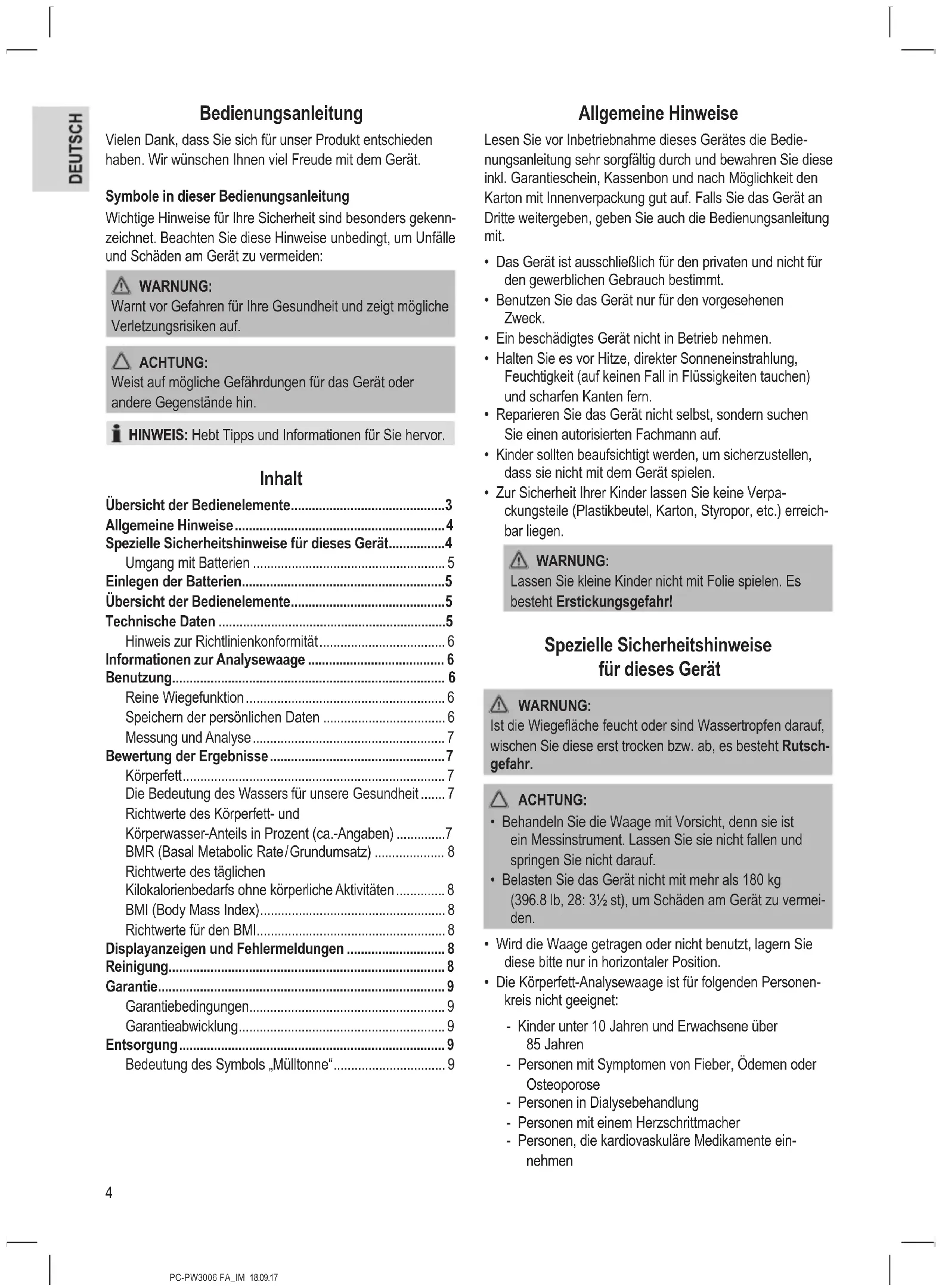 - Trocknen Sie das Gerät nach der Reinigung mit einem trockenen, weichen Tuch gut ab.9 PC-PW3006 FA_IM 18.09.17 Garantie Garantiebedingungen