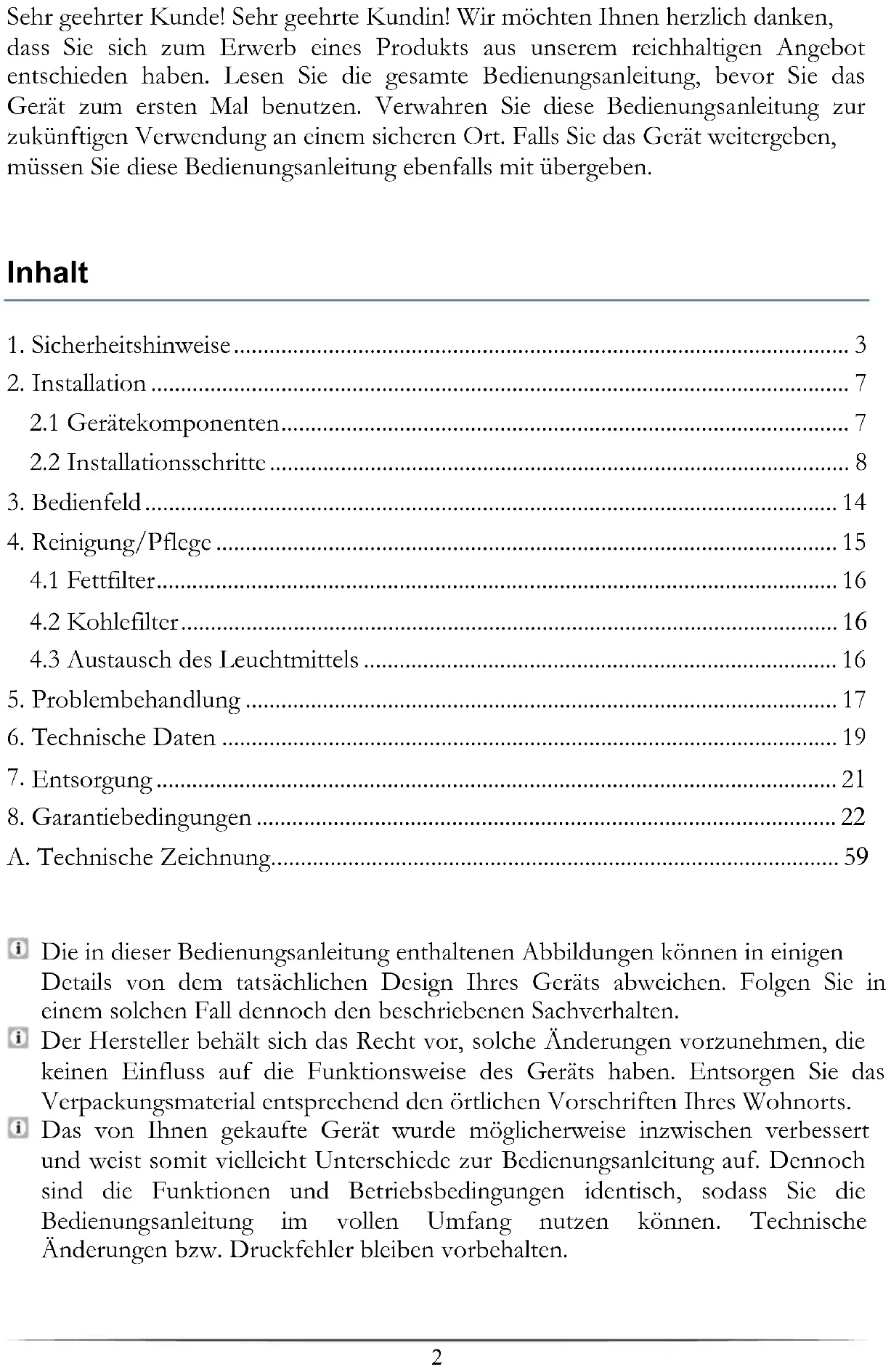 Garantiebedingungen .................................................................................................. 22 A. Technische Zeichnung................................................................................................ 59 Die in dieser Bedienungsanleitung enthaltenen Abbildungen können in einigen Details von dem tatsächlichen Design Ihres Geräts abweichen. Folgen Sie in einem solchen Fall dennoch den beschriebenen Sachverhalten. Der Hersteller behält sich das Recht vor, solche Änderungen vorzunehmen, die keinen Einfluss auf die Funktionsweise des Geräts haben. Entsorgen Sie das Verpackungsmaterial entsprechend den örtlichen Vorschriften Ihres Wohnorts. Das von Ihnen gekaufte Gerät wurde möglicherweise inzwischen verbessert und weist somit vielleicht Unterschiede zur Bedienungsanleitung auf. Dennoch sind die Funktionen und Betriebsbedingungen identisch, sodass Sie die Bedienungsanleitung im vollen Umfang nutzen können. Technische Änderungen bzw. Druckfehler bleiben vorbehalten.3 EG - Konformitätserklärung Die in dieser Bedienungsanleitung beschriebenen Produkte entsprechen sämtlichen harmonisierten Anforderungen. Die relevanten Unterlagen können durch die zuständigen Behörden über den Produktverkäufer angefordert werden.