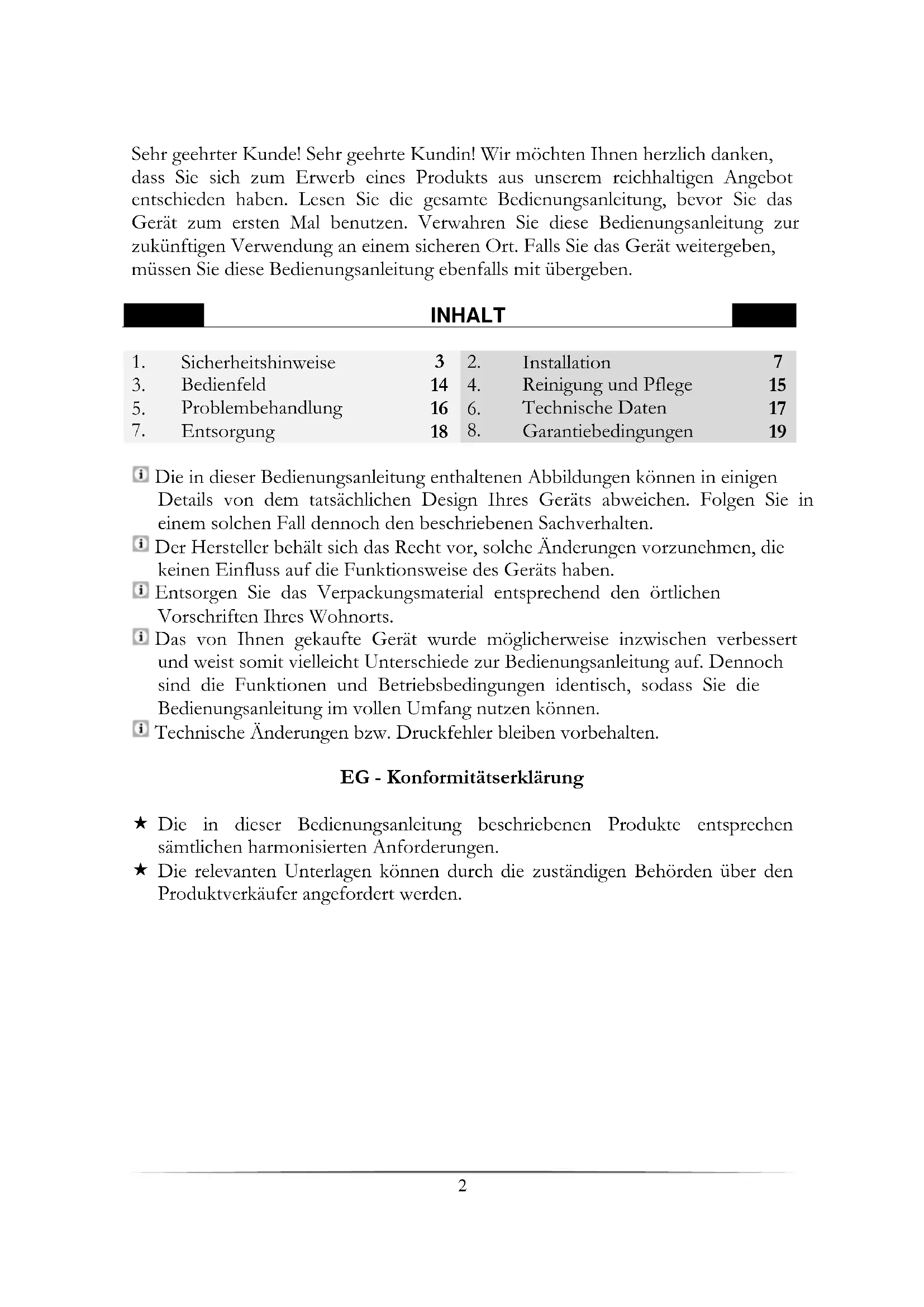 Schr geCHRter Kunde! Schr geCHRte Kundin! Wir mochten Ihnen herzlich danken, dass Sie sich zum Erwerb eines Produkts aus unserem reichhaltigen Angebott entschieden haben. Lesen Sie die gesamte Bedienungsanleitung, bevor Sie das Gerät zum ersten Mal benutzen. Verwahren Sie diese Bedienungsanleitung zur zukünftigen Verwendung an einem sicheren Ort. Falls Sie das Gerät weitergeben, müssen Sie diese Bedienungsanleitung ebenfalls mit übergeben.