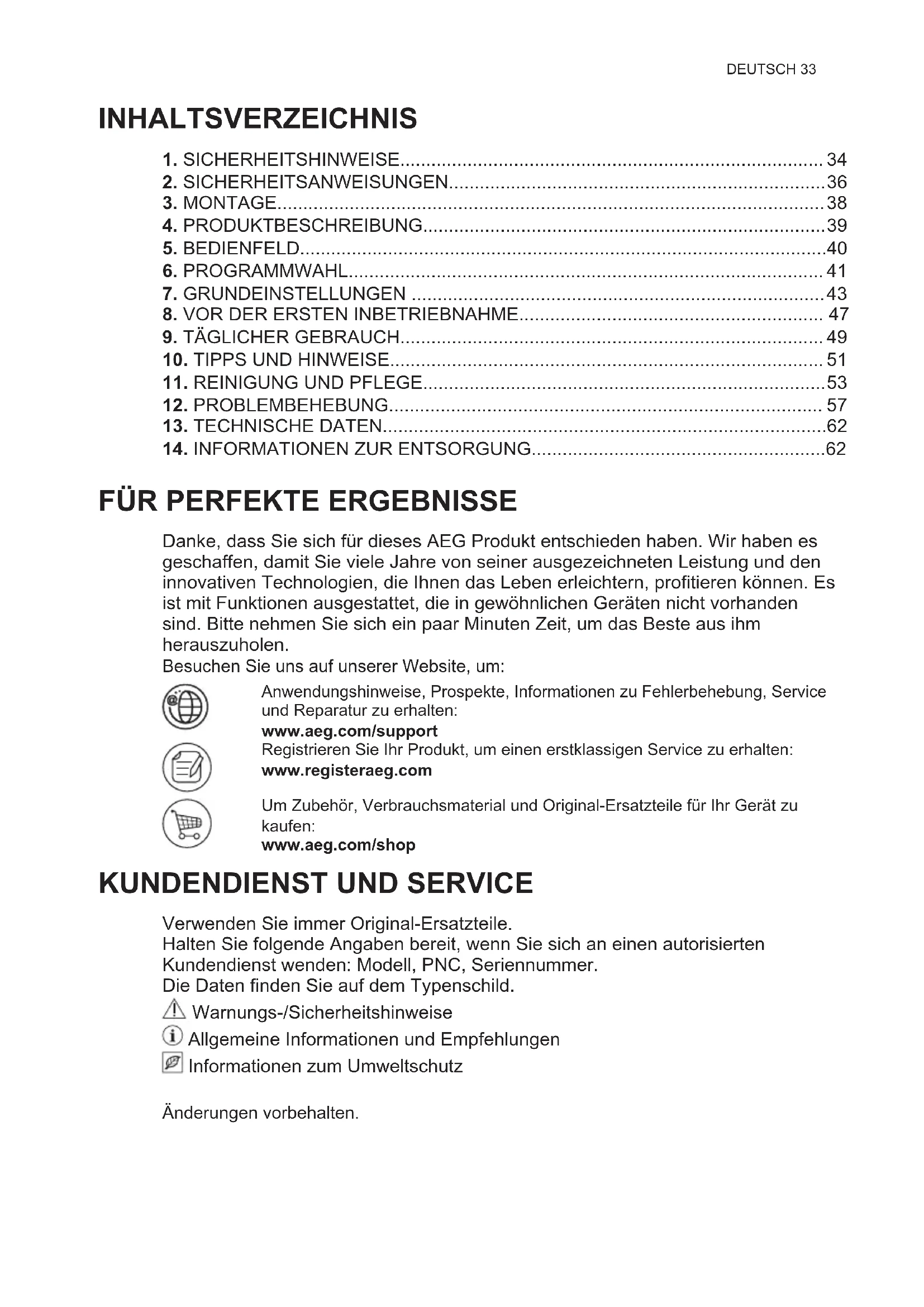 Danke, dass Sie sich für dieses AEG Produkt entschieden haben. Wir haben es geschaffen, damit Sie viele Jahre von seiner ausgezeichneten Leistung und den innovativen Technologien, die Ihnen das Leben erleichtern, profitieren können. Es ist mit Funktionen ausgestattet, die in gewöhnlichen Geräten nicht vorhanden sind. Bitte nehmen Sie sich ein paar Minuten Zeit, um das Beste aus ihm herauszuholen. Besuchen Sie uns auf unserer Website, um: Anwendungshinweise, Prospekte, Informationen zu Fehlerbehebung, Service und Reparatur zu erhalten: www.aeg.com/support Registrieren Sie Ihr Produkt, um einen erstklassigen Service zu erhalten: www.registeraeg.com Um Zubehör, Verbrauchsmaterial und Original-Ersatzteile für Ihr Gerät zu kaufen: www.aeg.com/shop