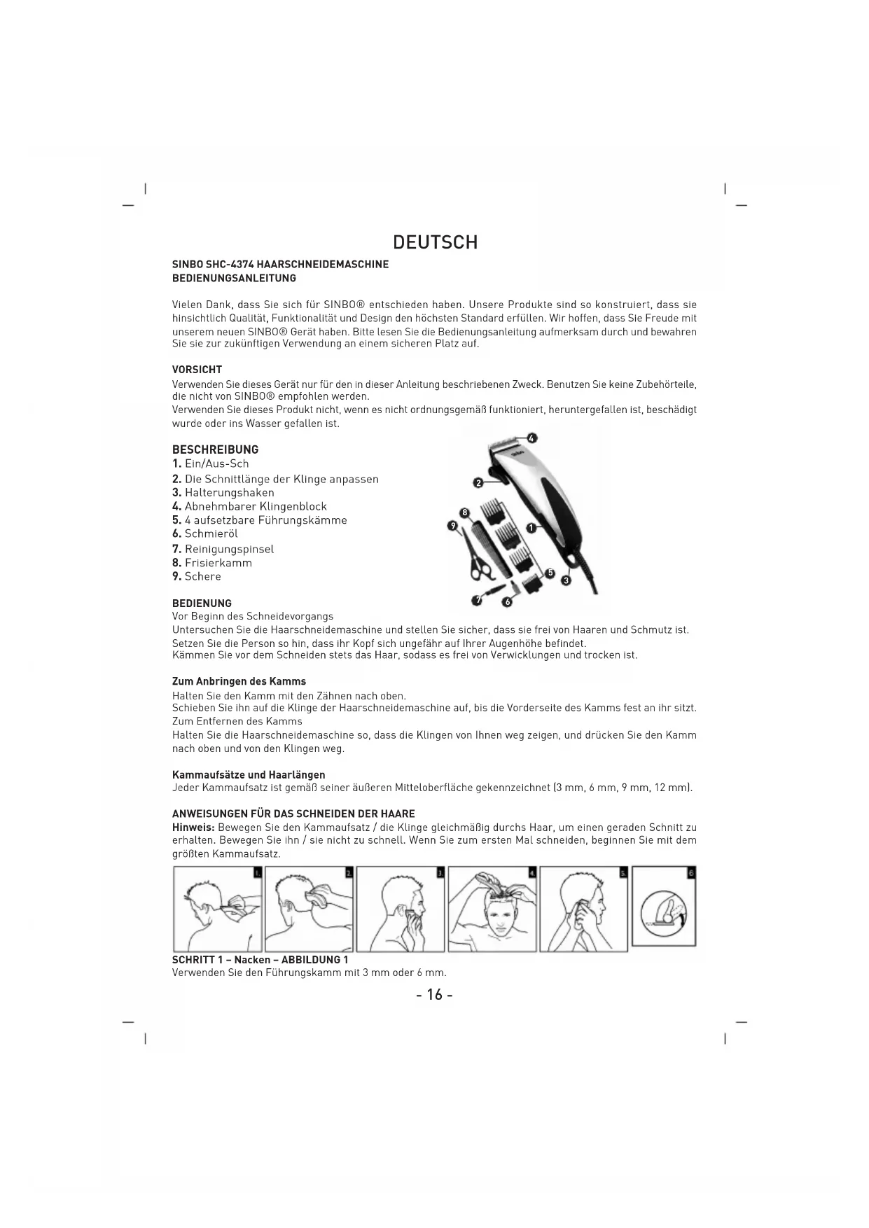 Das Klingenset sollte regelmäßig entfernt und gereinigt werden. Entfernen Sie die 2 Schrauben, mit denen die Klinge befestigt ist, mithilfe eines Schraubenziehers. Entfernen Sie nicht das Klingenset. Bürsten Sie die Haare zwischen den Klingen mit einer weichen Reinigungsbürste ab. Entfernen Sie nicht das Schmieröl von den Klingen. Es ist nicht erforderlich, die kleine, sich bewegende Klinge vom Gerät zu entfernen. Wenn die sich bewegende Klinge entfernt wurde, kann sie wieder eingesetzt werden, indem die lange, genutete- 18 - Kante der Klinge auf die beiden weißen Plastik-Führungskanten aufgeschoben wird und die Klinge dann über die Plastik-Antriebsstange eingesetzt wird. Die feste Klinge wird mithilfe der 2 Schrauben und mit dem gewölbten Profil nach außen befestigt. Stellen Sie den Neigungshebel vor dem Festdrehen der Schrauben auf die untere Position ein und richten Sie die Klingen so aus, dass ihre Schneidekanten parallel zueinander stehen. Drehen Sie die 2 Schrauben fest. Beachten Sie, dass die Schneideleistung beeinträchtigt wird, wenn die Klingen nicht ordnungsgemäß ausgerichtet sind. VORSICHT: Verwenden Sie keine flüssigen Reinigungsmittel oder aggressive oder korrosive Chemikalien am Klingengehäuse. Verwenden Sie stets eine weiche Bürste, um das angesammelte Haar zu entfernen. Trennen Sie den Ladeadapter von der Netzstromversorgung, wenn Sie die Aufsätze einsetzen oder abnehmen oder während Sie das Produkt reinigen. Bewahren Sie dieses Gerät stets in einer trockenen Umgebung auf. Wickeln Sie nicht das Kabel um das Gerät. PROBLEMBEHEBUNG Wenn die Klingen das Haar nicht einfach schneiden, kann der Neigungshebel (ABBILDUNG 6) verwendet werden, um zwischen Kamm und Klinge befindliches Haar zu entfernen. Schalten Sie die Haarschneidemaschine ein und bewegen Sie den Neigungshebel mehrfach nach oben und nach unten, aber drücken Sie ihn nicht mit Gewalt in eine der Richtungen. Dadurch werden die Haare entfernt und die Schneideeffizienz wieder hergestellt. Ist dies nicht der Fall, kontaktieren Sie das nächstgelegene SINBO ® Service Center. WICHTIGE SICHERHEITSHINWEISE WARNHINWEIS – ZUR VERRINGERUNG DES RISIKOS VON VERBRENNUNGEN, STROMSCHLÄGEN, FEUER ODER VERLETZUNGEN: Ein Gerät darf niemals unbeaufsichtigt sein, während es mit der Netzstromversorgung verbunden ist. Halten Sie den Stromstecker und das Stromkabel von heißen Oberflächen fern. Stellen Sie sicher, dass der Stromstecker und das Stromkabel nicht nass werden. Stecken Sie die Haarschneidemaschine nicht mit nassen Händen in die Stromversorgung ein oder trennen ihn. Verwenden Sie das Produkt nicht, wenn das Stromkabel beschädigt ist. Ersatz kann über das SINBO® Service Center beschafft werden. Laden, benutzen und lagern Sie das Produkt bei einer Temperatur zwischen 15 und 35 °C. Trennen Sie es stets von der Netzstromversorgung ab, wenn Sie es reinigen. Verwenden Sie nur die im Lieferumfang enthaltenen Teile zusammen mit dem Gerät. Bewahren Sie dieses Produkt außerhalb der Reichweite von Kindern auf. Die Verwendung dieses Gerätes durch Personen mit eingeschränkter physischer, sensorischer oder mentaler Kapazität oder mangelnder Erfahrung und mangelnder Kenntnis kann Gefahren mit sich bringen. Die für deren Sicherheit verantwortlichen Personen müssen explizite Anweisungen geben oder in die Benutzung des Gerätes einweisen. MERKMALE - Abnehmbarer Klingenblock für problemlose Reinigung - Feingeschliffene Edelstahlklinge - Selbstschärfende Klingen - Supermagnetmotor - Hervorragende Schärfe - Drucktaste: für höchste Präzision beim Schneiden - 4 Führungskämme: für eine Vielzahl an Längen und Stylingoptionen Zubehör: - 1x Schere - 1x Frisierkamm - 1x Reinigungspinsel - 1x Schmieröl- 19 - - 1x Klingenschutz - 4x Schneidaufsätze (3, 6, 9, 12 mm) - AC 230 V, 50 Hz, 9W UMWELTSCHUTZ Entsorgen Sie die Haarschneidemaschine am Ende ihrer Lebensdauer nicht im Hausmüll. Die Entsorgung kann beim SINBO® Service Center oder bei geeigneten Sammelstellen erfolgen.- 20 - ESPANOL