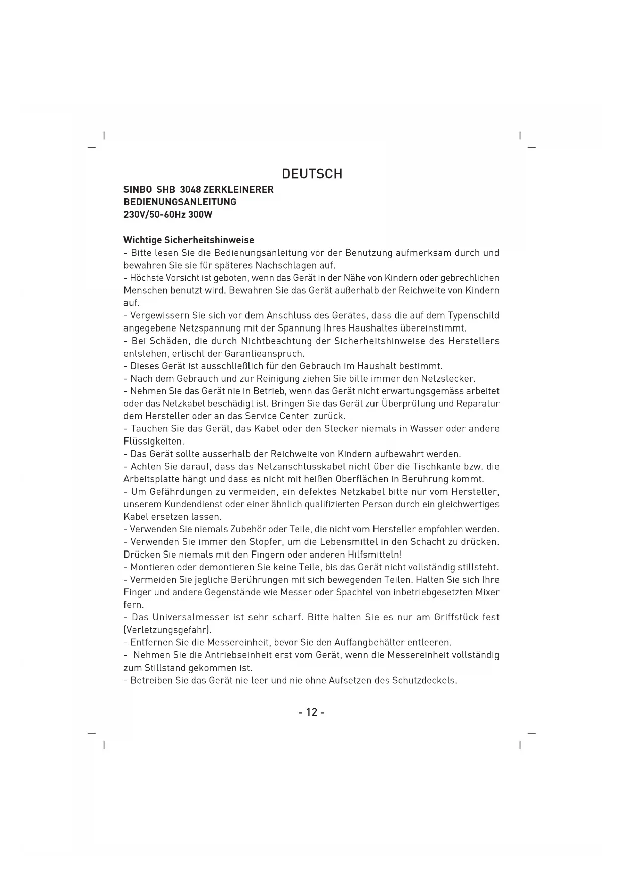 BEDIENUNGSANLEITUNG SHB 3048 SINBO