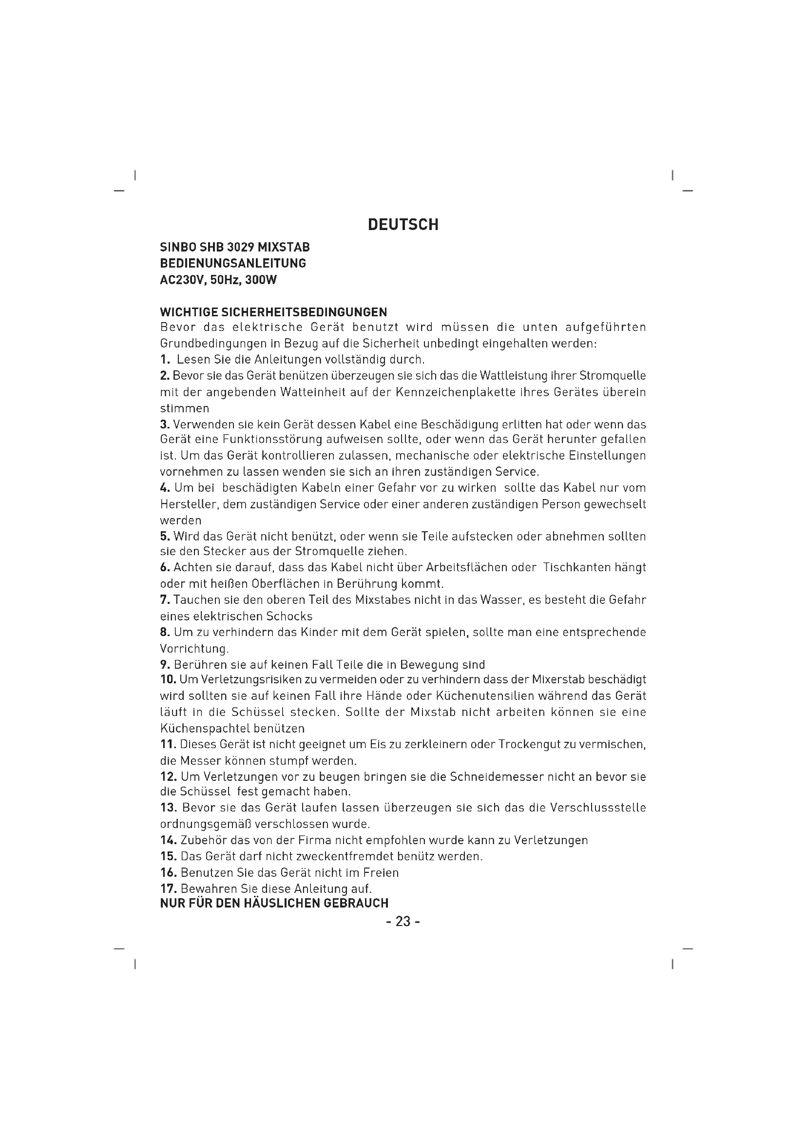BEDIENUNGSANLEITUNG SHB 3029 SINBO