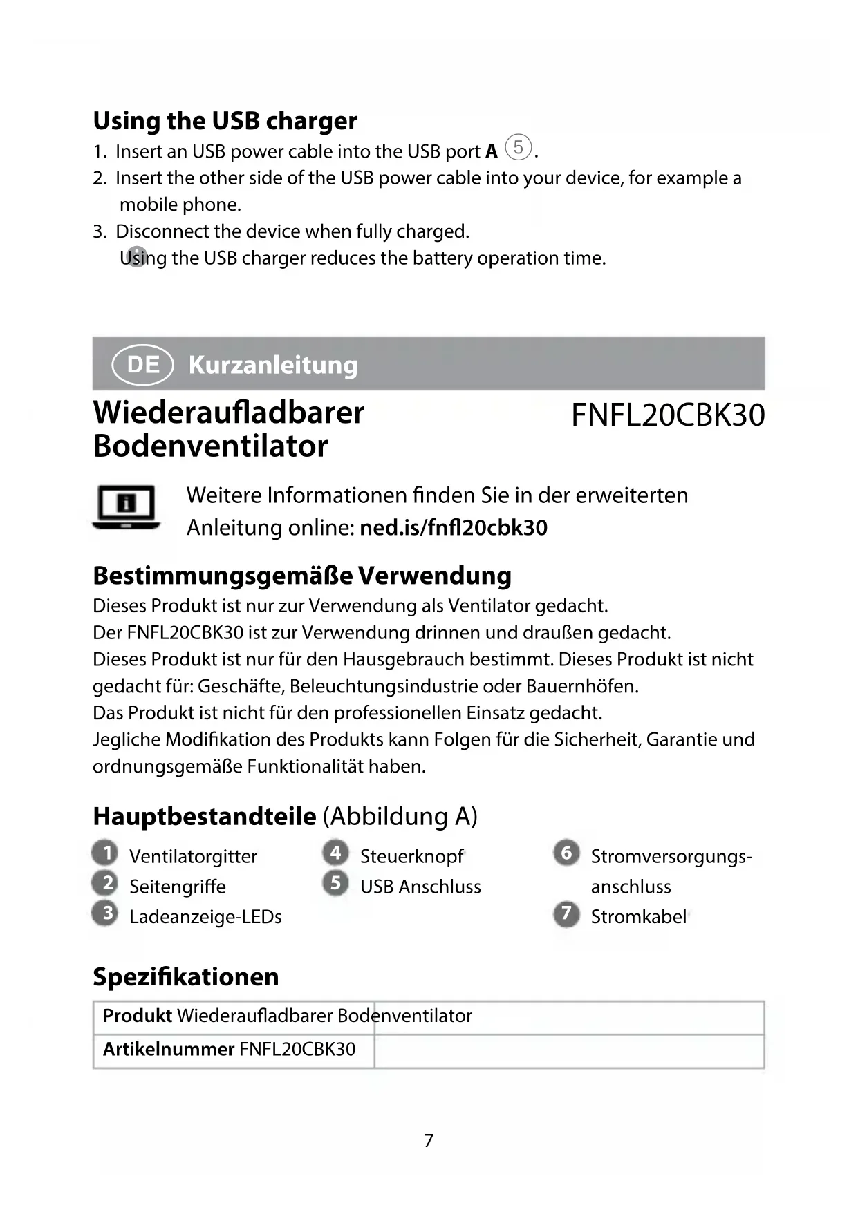 Kurzanleitung Wiederauadbarer Bodenventilator FNFL20CBK30 Weitere Informationen nden Sie in der erweiterten Anleitung online: ned.is/fn20cbk30 Bestimmungsgemäße Verwendung Dieses Produkt ist nur zur Verwendung als Ventilator gedacht.Der FNFL20CBK30 ist zur Verwendung drinnen und draußen gedacht.Dieses Produkt ist nur für den Hausgebrauch bestimmt. Dieses Produkt ist nicht gedacht für: Geschäfte, Beleuchtungsindustrie oder Bauernhöfen.Das Produkt ist nicht für den professionellen Einsatz gedacht.Jegliche Modikation des Produkts kann Folgen für die Sicherheit, Garantie und ordnungsgemäße Funktionalität haben. Hauptbestandteile (Abbildung A)