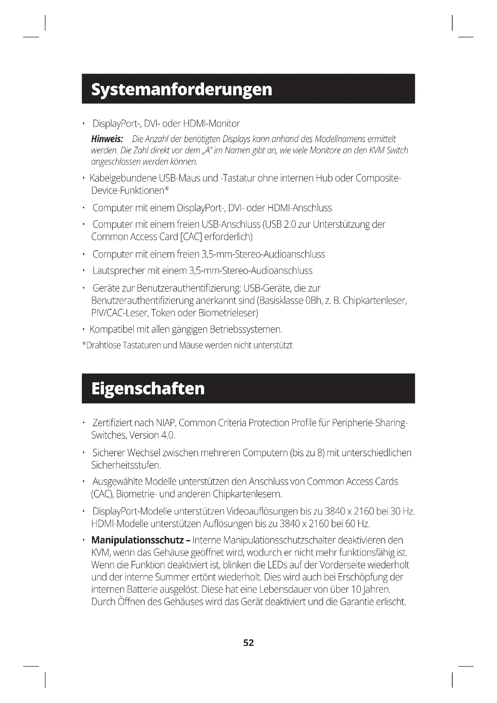 - Manipulationsschutz – Interne Manipulationsschutzschalter deaktivieren den KVM,wenndasGehäusegeönetwird,wodurchernichtmehrfunktionsfähigist. WenndieFunktiondeaktiviertist,blinkendieLEDsaufderVorderseitewiederholt undderinterneSummerertöntwiederholt.DieswirdauchbeiErschöpfungder internenBatterieausgelöst.DiesehateineLebensdauervonüber10Jahren. DurchÖnendesGehäuseswirddasGerätdeaktiviertunddieGarantieerlischt. Systemanforderungen Eigenschaften53 Eigenschaften