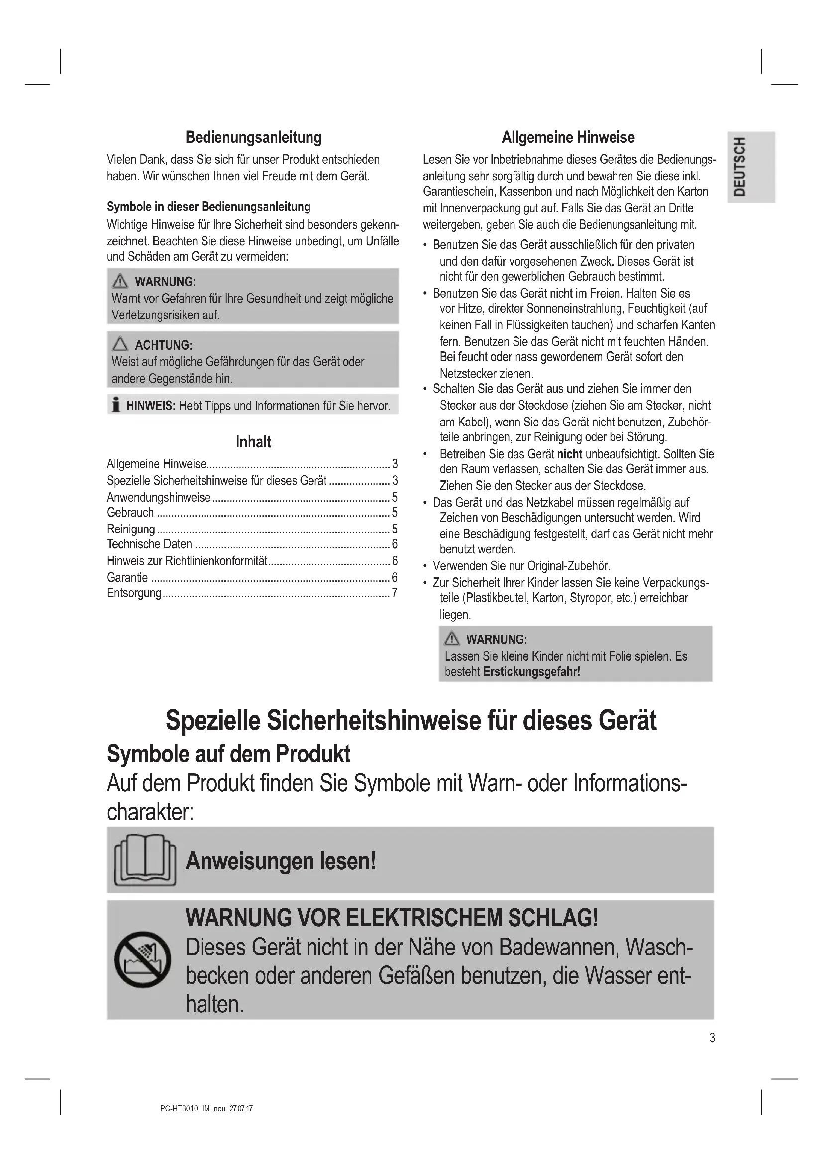 - Zur Sicherheit Ihrer Kinder lassen Sie keine Verpackungs- teile (Plastikbeutel, Karton, Styropor, etc.) erreichbar liegen. WARNUNG: Lassen Sie kleine Kinder nicht mit Folie spielen. Es besteht Erstickungsgefahr! Spezielle Sicherheitshinweise für dieses Gerät Symbole auf dem Produkt Auf dem Produkt nden Sie Symbole mit Warn- oder Informations- charakter: Anweisungen lesen! WARNUNG VOR ELEKTRISCHEM SCHLAG! Dieses Gerät nicht in der Nähe von Badewannen, Wasch- becken oder anderen Gefäßen benutzen, die Wasser ent- halten.4 PC-HT3010_IM_neu 27.07.17 WARNUNG: