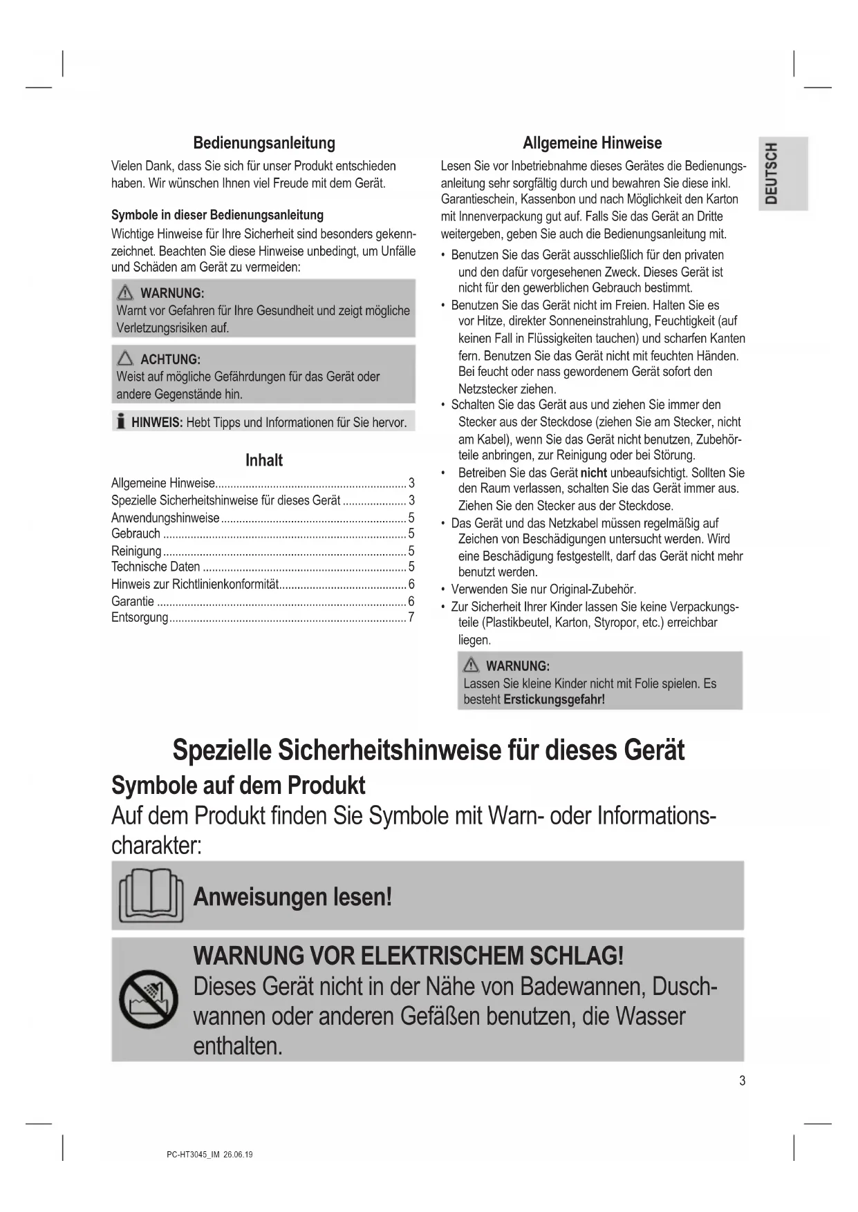 - Zur Sicherheit Ihrer Kinder lassen Sie keine Verpackungs- teile (Plastikbeutel, Karton, Styropor, etc.) erreichbar liegen. WARNUNG: Lassen Sie kleine Kinder nicht mit Folie spielen. Es besteht Erstickungsgefahr! Spezielle Sicherheitshinweise für dieses Gerät Symbole auf dem Produkt Auf dem Produkt nden Sie Symbole mit Warn- oder Informations- charakter: Anweisungen lesen! WARNUNG VOR ELEKTRISCHEM SCHLAG! Dieses Gerät nicht in der Nähe von Badewannen, Dusch- wannen oder anderen Gefäßen benutzen, die Wasser enthalten.4 PC-HT3045_IM 26.06.19 WARNUNG: