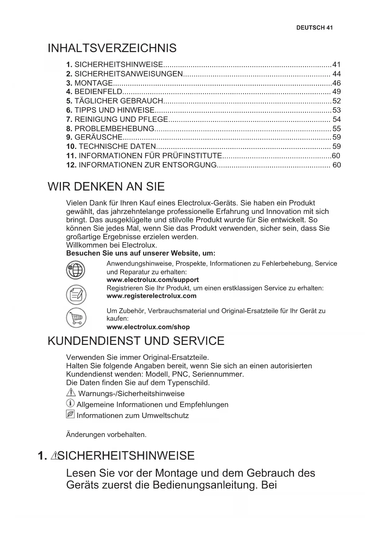Vielen Dank für Ihren Kauf eines Electrolux-Geräts. Sie haben ein Produkt gewählt, das jahrzehntelange professionelle Erfahrung und Innovation mit sich bringt. Das ausgeklügelte und stilvolle Produkt wurde für Sie entwickelt. So können Sie jedes Mal, wenn Sie das Produkt verwenden, sicher sein, dass Sie großartige Ergebnisse erzielen werden. Willkommen bei Electrolux. Besuchen Sie uns auf unserer Website, um: Anwendungshinweise, Prospekte, Informationen zu Fehlerbehebung, Service und Reparatur zu erhalten: www.electrolux.com/support Registrieren Sie Ihr Produkt, um einen erstklassigen Service zu erhalten: www.registerelectrolux.com Um Zubehör, Verbrauchsmaterial und Original-Ersatzteile für Ihr Gerät zu kaufen: www.electrolux.com/shop