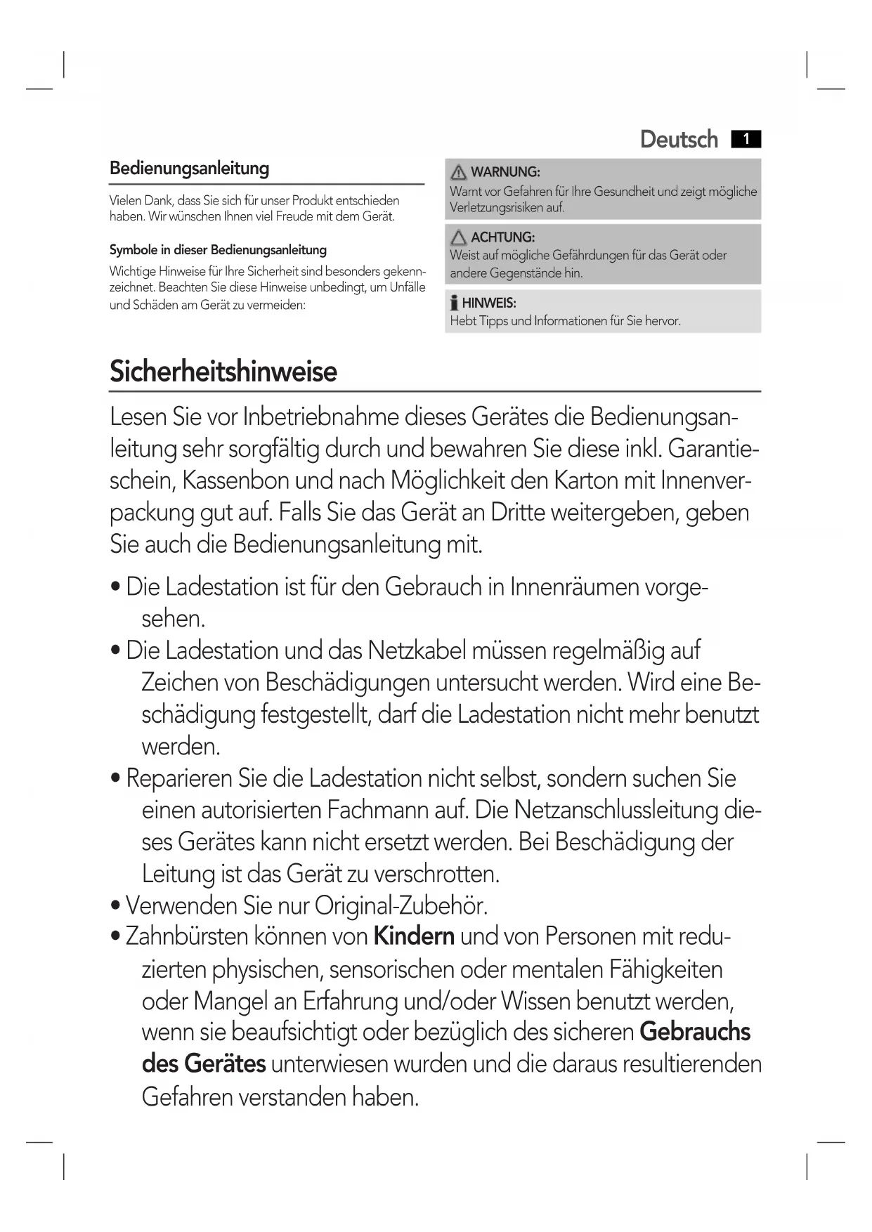 - Zahnbürsten können von Kindern und von Personen mit redu- zierten physischen, sensorischen oder mentalen Fähigkeiten oder Mangel an Erfahrung und/oder Wissen benutzt werden, wenn sie beaufsichtigt oder bezüglich des sicheren Gebrauchs des Gerätes unterwiesen wurden und die daraus resultierenden Gefahren verstanden haben.Deutsch