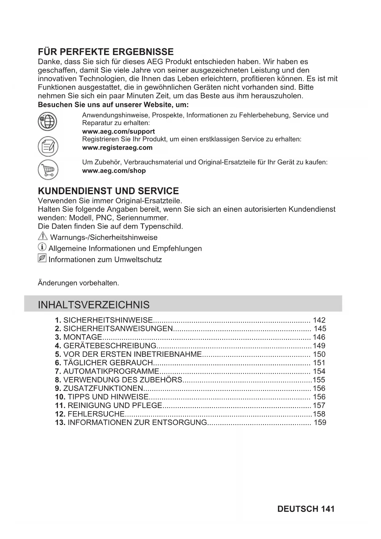 Danke, dass Sie sich für dieses AEG Produkt entschieden haben. Wir haben es geschaffen, damit Sie viele Jahre von seiner ausgezeichneten Leistung und den innovativen Technologien, die Ihnen das Leben erleichtern, profitieren können. Es ist mit Funktionen ausgestattet, die in gewöhnlichen Geräten nicht vorhanden sind. Bitte nehmen Sie sich ein paar Minuten Zeit, um das Beste aus ihm herauszuholen. Besuchen Sie uns auf unserer Website, um: Anwendungshinweise, Prospekte, Informationen zu Fehlerbehebung, Service undReparatur zu erhalten:www.aeg.com/supportRegistrieren Sie Ihr Produkt, um einen erstklassigen Service zu erhalten:www.registeraeg.comUm Zubehör, Verbrauchsmaterial und Original-Ersatzteile für Ihr Gerät zu kaufen:www.aeg.com/shop