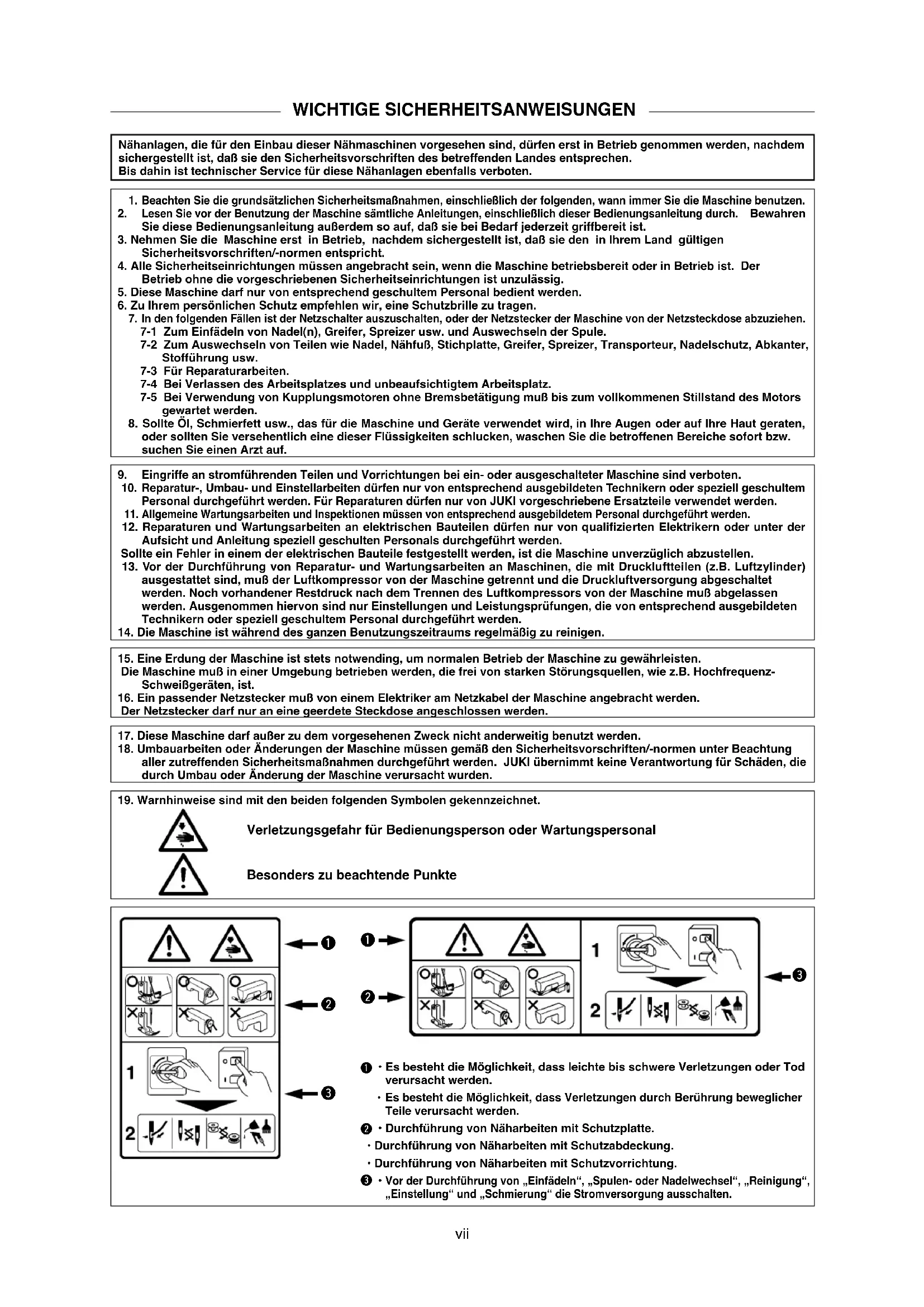 - 待缝纫机确实停止之后再操作飞轮。vii WICHTIGE SICHERHEITSANWEISUNGEN Nähanlagen, die für den Einbau dieser Nähmaschinen vorgesehen sind, dürfen erst in Betrieb genommen werden, nachdem sichergestellt ist, daß sie den Sicherheitsvorschriften des betreffenden Landes entsprechen. Bis dahin ist technischer Service für diese Nähanlagen ebenfalls verboten. 1. Beachten Sie die grundsätzlichen Sicherheitsmaßnahmen, einschließlich der folgenden, wann immer Sie die Maschine benutzen.