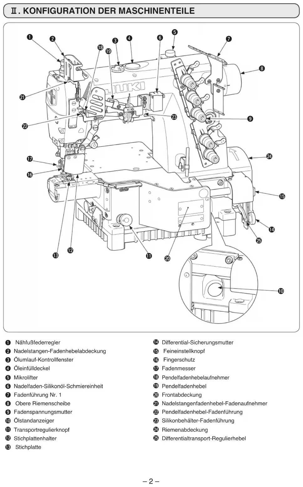 1 Nähfußfederregler!4 Differential-Sicherungsmutter2Nadelstangen-Fadenhebelabdeckung!5 Feineinstellknopf3Ölumlauf-Kontrollfenster!6 Fingerschutz4Öleinfülldeckel!7Fadenmesser5Mikrolifter!8 Pendelfadenhebelaufnehmer6Nadelfaden-Silikonöl-Schmiereinheit!9Pendelfadenhebel7Fadenführung Nr. 1@0Frontabdeckung8 Obere Riemenscheibe@1Nadelstangenfadenhebel-Fadenaufnehmer9Fadenspannungsmutter@2Pendelfadenhebel-Fadenführung!0 Ölstandanzeiger@3Silikonbehälter-Fadenführung!1Transportregulierknopf@4Riemenabdeckung!2 Stichplattenhalter@5 Differentialtransport-Regulierhebel!3 Stichplatte123456789!0!1!2!3!4!5!6!7!8!9@4@0@2@1@3@5