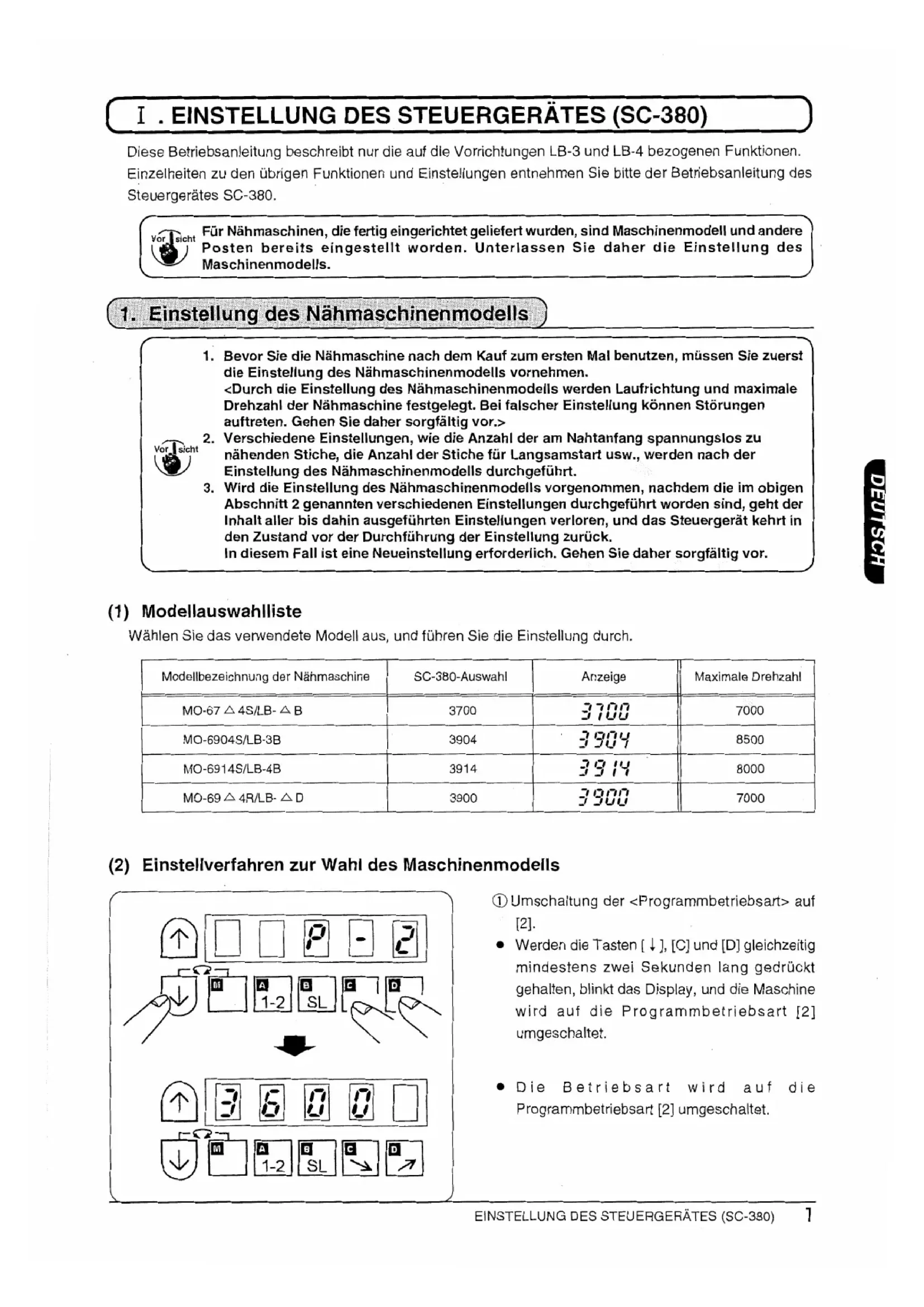 Abschnitt 2genanntenverschiedenen Einstellungen durchgefuhrtwardensind, geht der lnhalt alter bis dahin ausgefuhrten Einstellungen verloren, unddasSteuergerat kehrt in denZustandvor der Durchfuhrung der Einstellung zuruck. In diesemFall ist eine Neueinstellung erforderlich. GehenSie daher sorgfaltig vor. (1) Modellauswahlliste WahlenSie dasverwendete Modell aus, undfuhren Sie die Einstellung durch. Modellbezeichnung der Nahmaschine SC‑380‑Auswahl Anzeige Maximale DrehzahlM0‑67 4S/LB —• B 3700