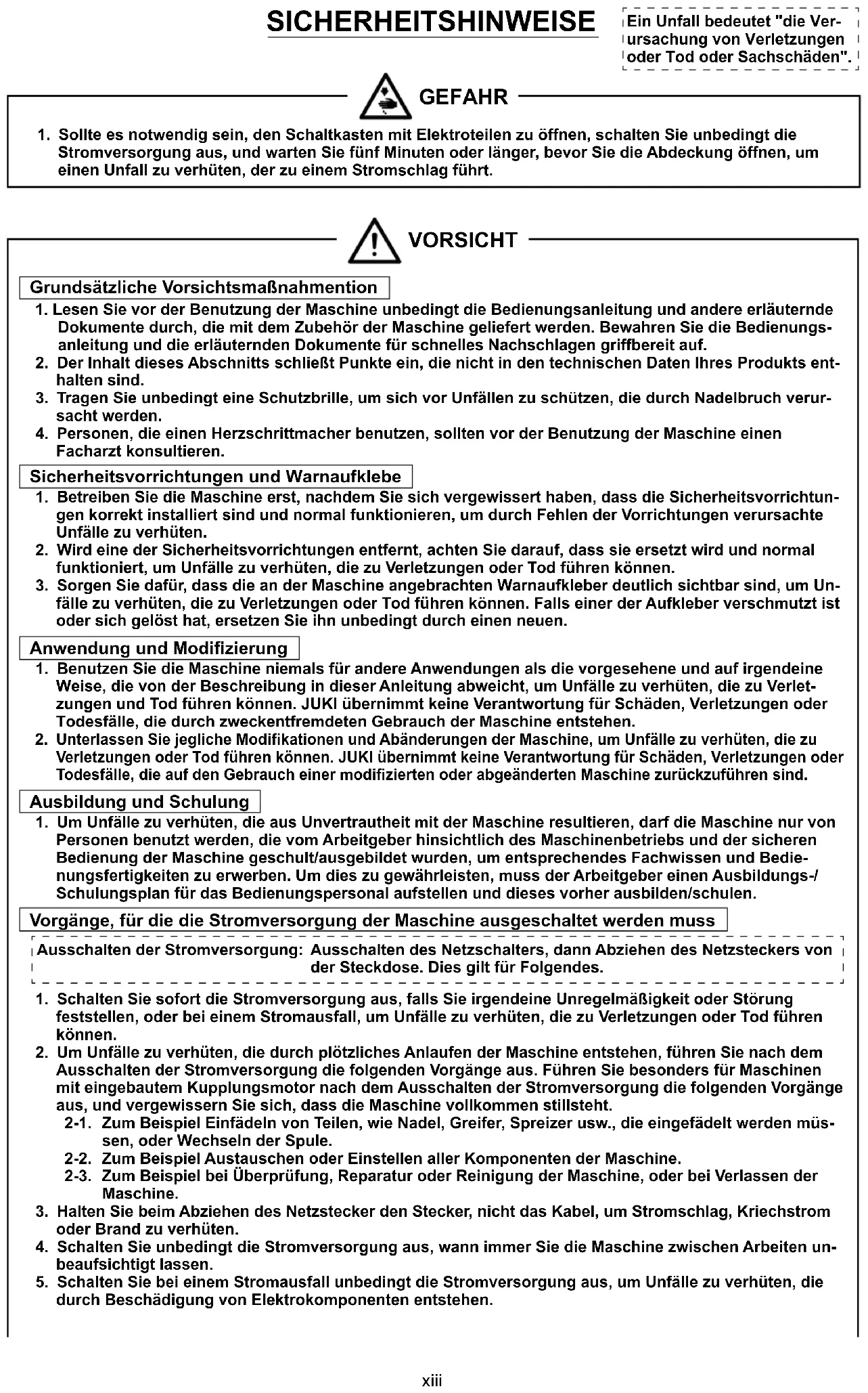 なお、取扱説明書では説明の都合上「目保護カバー 」 や「指ガード 」 などの安全装置を省いて図示 している場合がありますので、あらかじめご了承ください。 実際の使用にあたっては、これら安全装置を絶対に外さないでください。xii Für eine Nähmaschine, automatische Maschine und Zusatzvorrichtungen (im Folgenden kollektiv als "Ma- schine" bezeichnet), ist es unerlässlich, die Näharbeit in der Nähe von beweglichen Teilen der Maschine durchzuführen. Dies bedeutet, dass stets die Möglichkeit besteht, versehentlich mit den beweglichen Teilen in Berührung zu kommen. Daher empfehlen wir dem Bedienungs- und Wartungspersonal, das sich mit der Bedienung, Wartung und Reparatur der Maschine befasst, dringend, vor der Benutzung/Wartung der Maschi- ne die folgenden SICHERHEITSHINWEISE aufmerksam zu lesen und voll zu verstehen. Der Inhalt der SICHERHEITSHINWEISE schließt Punkte ein, die nicht in den technischen Daten Ihres Produkts enthalten sind. Die Gefahrenbezeichnungen sind in die folgenden drei Kategorien eingeteilt, um die Bedeutung der Aufkleber zu verstehen. Machen Sie sich unbedingt mit der folgenden Beschreibung vertraut, und halten Sie sich genau an die Anweisungen. (II) ErllXWerXng Ger %ilGZarnKinZeiVe XnG WarnaXINleber WarnaXINleber