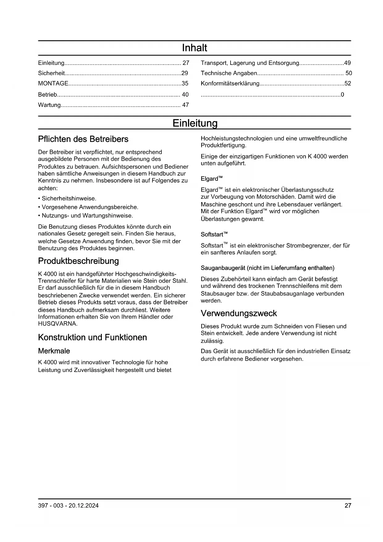 - Nutzungs- und Wartungshinweise. Die Benutzung dieses Produktes könnte durch ein nationales Gesetz geregelt sein. Finden Sie heraus, welche Gesetze Anwendung finden, bevor Sie mit der Benutzung des Produktes beginnen. Produktbeschreibung K 4000 ist ein handgeführter Hochgeschwindigkeits- Trennschleifer für harte Materialien wie Stein oder Stahl. Er darf ausschließlich für die in diesem Handbuch beschriebenen Zwecke verwendet werden. Ein sicherer Betrieb dieses Produkts setzt voraus, dass der Betreiber dieses Handbuch aufmerksam durchliest. Weitere Informationen erhalten Sie von Ihrem Händler oder HUSQVARNA. Konstruktion und Funktionen Merkmale K 4000 wird mit innovativer Technologie für hohe Leistung und Zuverlässigkeit hergestellt und bietet Hochleistungstechnologien und eine umweltfreundliche Produktfertigung. Einige der einzigartigen Funktionen von K 4000 werden unten aufgeführt. Elgard