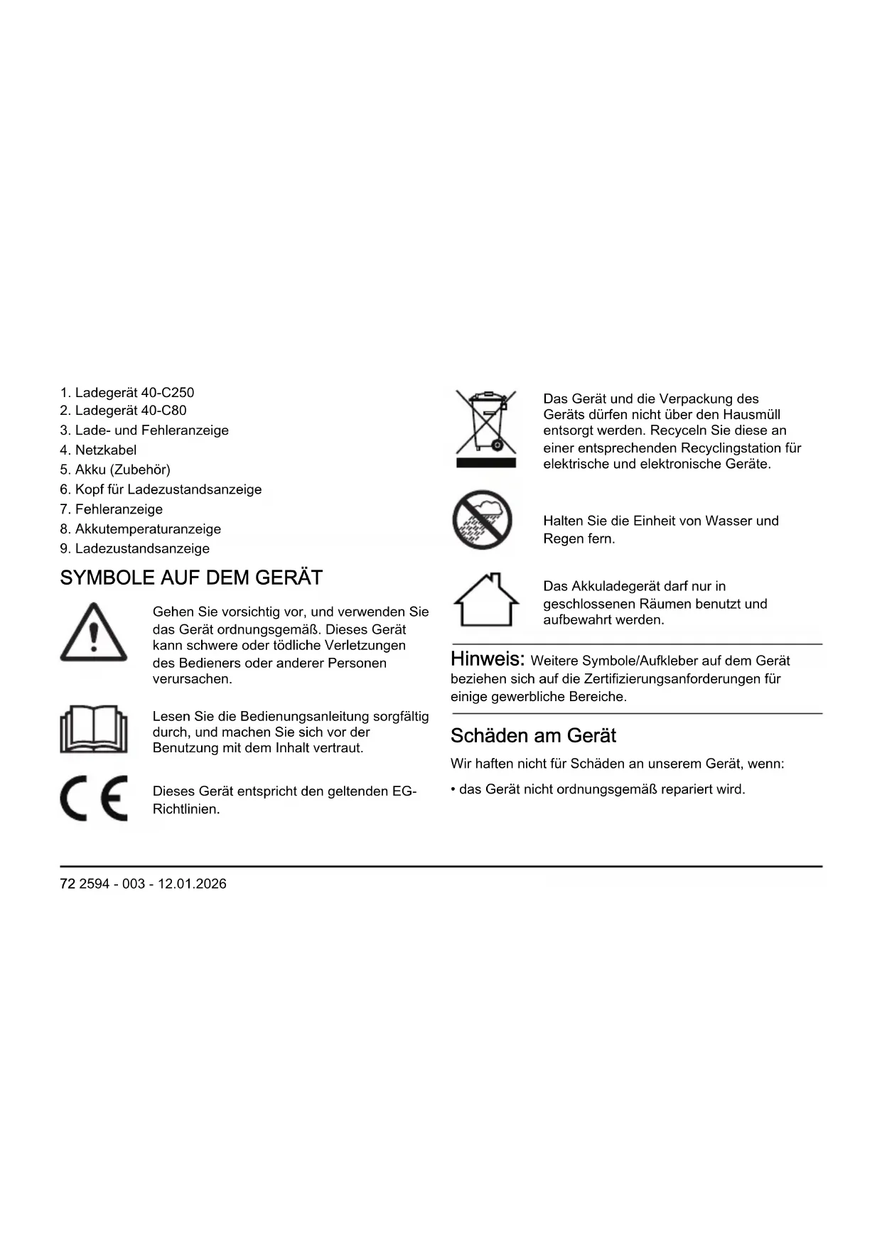 - Achten Sie bei der Lagerung darauf, dass sich der Akku nicht in unmittelbarer Nähe zum Ladegerät befindet. Entsorgen Das Symbol bedeutet, dass das Gerät nicht über den Hausmüll entsorgt werden darf. Recyceln Sie es über Ihre örtliche Entsorgungsstelle für elektrische und elektronische Geräte. Damit tragen Sie zu einem ordnungsgemäßen Abfallmanagement bei. Wenden Sie sich an die örtlichen Behörden, Abfallentsorgungsdienste, Ihren Händler oder Verkäufer, um weitere Informationen zu erhalten. Eine unsachgemäße Entsorgung kann sich negativ auf die Umwelt und die Gesundheit des Menschen auswirken, da potenziell Gefahrstoffe vorhanden sein können. Hinweis: Das Symbol ist auf dem Gerät oder der Verpackung des Geräts zu finden. 2594 - 003 - 12.01.2026 83Entsorgen von Elektro- und Elektronik- Altgeräten Gilt nur für Deutschland Die durchgestrichene Abfalltonne weist darauf hin, dass Sie gesetzlich verpflichtet sind, dieses Gerät getrennt vom unsortierten Siedlungsabfall zu entsorgen. Die Entsorgung im Restmüll oder im gelben Sack ist verboten. Wenn das Produkt Einwegbatterien oder Akkus enthält, die nicht dauerhaft installiert sind, müssen diese vor der Entsorgung des Produkts entfernt und separat als Batterien bzw. Akkus entsorgt werden. Entfernen von Batterien, Akkus und Leuchtmitteln: Batterien, Akkus oder Leuchtmittel, die aus dem Produkt entfernt werden können, ohne es zu beschädigen, müssen vor der Entsorgung entfernt und separat als Batterien, Akkus oder Leuchtmittel entsorgt werden. Die folgenden Batterien oder Akkus sind in diesem Produkt enthalten: