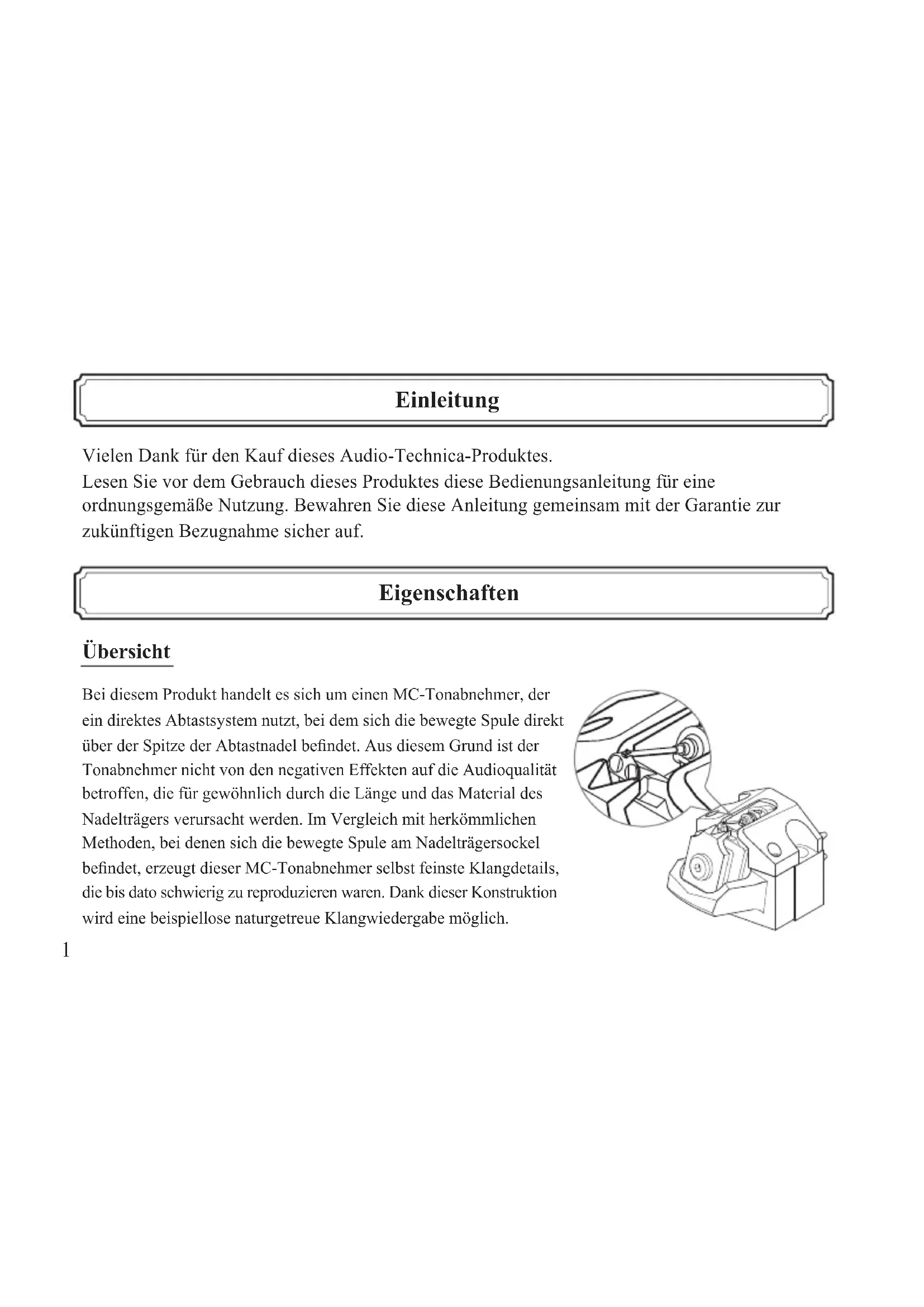 - Set de ls PCOCC Les caractéristiques sont susceptibles d’être modiées sans notication préalable suite à des améliorations.1 Einleitung Eigenschaften Vielen Dank für den Kauf dieses Audio-Technica-Produktes. Lesen Sie vor dem Gebrauch dieses Produktes diese Bedienungsanleitung für eine ordnungsgemäße Nutzung. Bewahren Sie diese Anleitung gemeinsam mit der Garantie zur zukünftigen Bezugnahme sicher auf. Übersicht Bei diesem Produkt handelt es sich um einen MC-Tonabnehmer, der ein direktes Abtastsystem nutzt, bei dem sich die bewegte Spule direkt über der Spitze der Abtastnadel bendet. Aus diesem Grund ist der Tonabnehmer nicht von den negativen Effekten auf die Audioqualität betroffen, die für gewöhnlich durch die Länge und das Material des Nadelträgers verursacht werden. Im Vergleich mit herkömmlichen Methoden, bei denen sich die bewegte Spule am Nadelträgersockel bendet, erzeugt dieser MC-Tonabnehmer selbst feinste Klangdetails, die bis dato schwierig zu reproduzieren waren. Dank dieser Konstruktion wird eine beispiellose naturgetreue Klangwiedergabe möglich.2