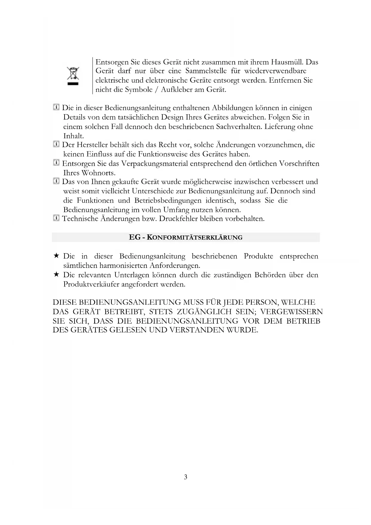 Die in dieser Bedienungsanleitung enthaltenen Abbildungen können in einigen Details von dem tatsächlichen Design Ihres Gerätes abweichen. Folgen Sie in einem solchen Fall dennoch den beschriebenen Sachverhalten. Lieferung ohne Inhalt. Der Hersteller behält sich das Recht vor, solche Änderungen vorzunehmen, die keinen Einfluss auf die Funktionsweise des Gerätes haben. Entsorgen Sie das Verpackungsmaterial entsprechend den örtlichen Vorschriften Ihres Wohnorts. Das von Ihnen gekaufte Gerät wurde möglicherweise inzwischen verbessert und weist somit vielleicht Unterschiede zur Bedienungsanleitung auf. Dennoch sind die Funktionen und Betriebsbedingungen identisch, sodass Sie die Bedienungsanleitung im vollen Umfang nutzen können. Technische Änderungen bzw. Druckfehler bleiben vorbehalten.
