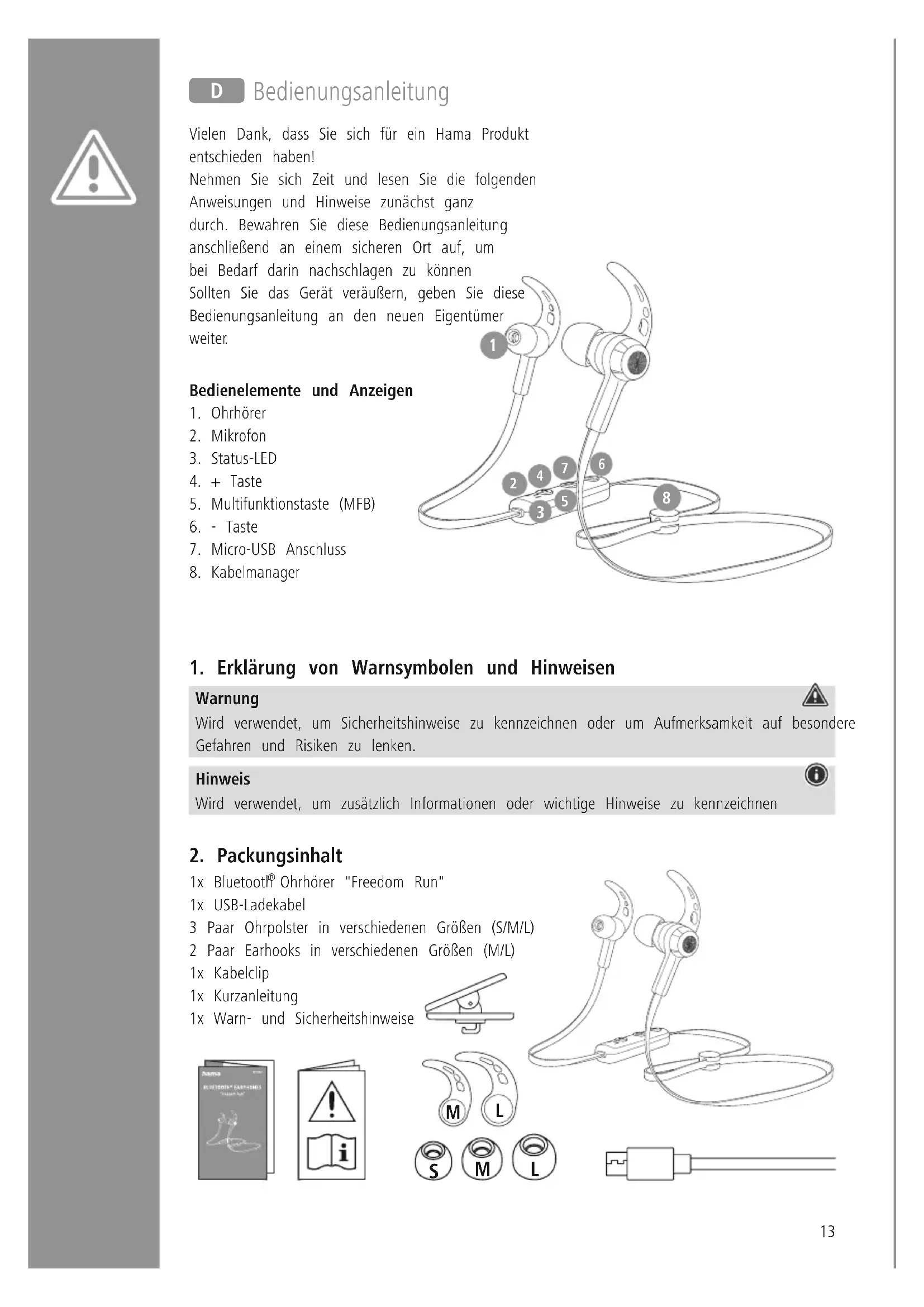 Ohrhörer "Freedom Run" 1x USB-Ladekabel 3 Paar Ohrpolster in verschiedenen Größen (S/M/L) 2 Paar Earhooks in verschiedenen Größen (M/L) 1x Kabelclip 1x Kurzanleitung 1x Warn- und Sicherheitshinweise
