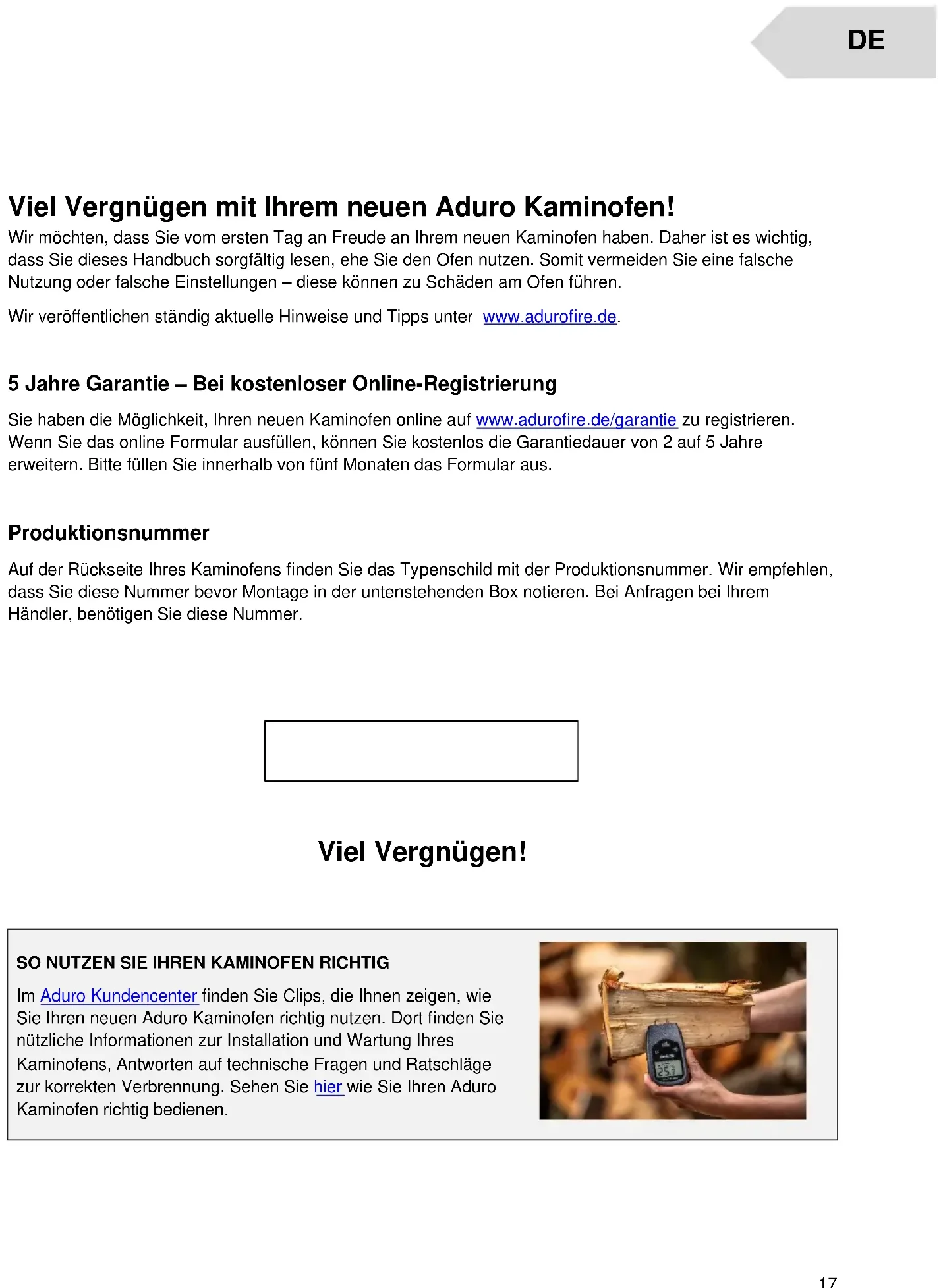 Viel Vergnügen mit Ihrem neuen Aduro Kaminofen! Wir möchten, dass Sie vom ersten Tag an Freude an Ihrem neuen Kaminofen haben. Daher ist es wichtig, dass Sie dieses Handbuch sorgfältig lesen, ehe Sie den Ofen nutzen. Somit vermeiden Sie eine falsche Nutzung oder falsche Einstellungen – diese können zu Schäden am Ofen führen. Wir veröffentlichen ständig aktuelle Hinweise und Tipps unter www.adurofire.de. 5 Jahre Garantie – Bei kostenloser Online-Registrierung Sie haben die Möglichkeit, Ihren neuen Kaminofen online auf www.adurofire.de/garantie zu registrieren. Wenn Sie das online Formular ausfüllen, können Sie kostenlos die Garantiedauer von 2 auf 5 Jahre erweitern. Bitte füllen Sie innerhalb von fünf Monaten das Formular aus. Produktionsnummer Auf der Rückseite Ihres Kaminofens finden Sie das Typenschild mit der Produktionsnummer. Wir empfehlen, dass Sie diese Nummer bevor Montage in der untenstehenden Box notieren. Bei Anfragen bei Ihrem Händler, benötigen Sie diese Nummer.