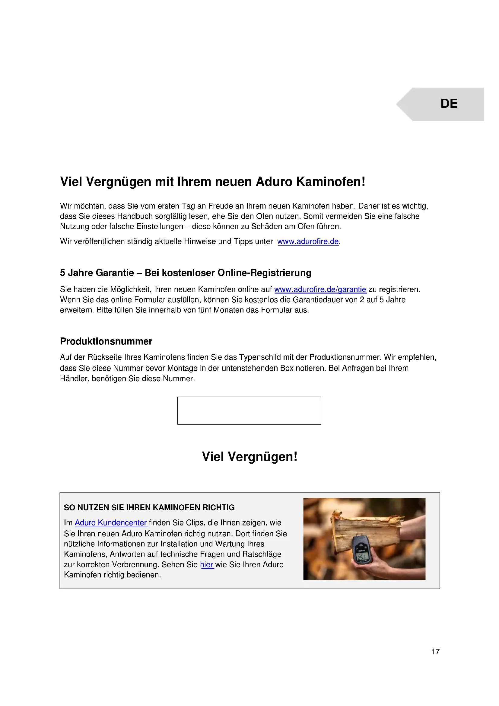 Viel Vergnügen mit Ihrem neuen Aduro Kaminofen! Wir möchten, dass Sie vom ersten Tag an Freude an Ihrem neuen Kaminofen haben. Daher ist es wichtig, dass Sie dieses Handbuch sorgfältig lesen, ehe Sie den Ofen nutzen. Somit vermeiden Sie eine falsche Nutzung oder falsche Einstellungen – diese können zu Schäden am Ofen führen. Wir veröffentlichen ständig aktuelle Hinweise und Tipps unter www.adurofire.de. 5 Jahre Garantie – Bei kostenloser Online-Registrierung Sie haben die Möglichkeit, Ihren neuen Kaminofen online auf www.adurofire.de/garantie zu registrieren. Wenn Sie das online Formular ausfüllen, können Sie kostenlos die Garantiedauer von 2 auf 5 Jahre erweitern. Bitte füllen Sie innerhalb von fünf Monaten das Formular aus. Produktionsnummer Auf der Rückseite Ihres Kaminofens finden Sie das Typenschild mit der Produktionsnummer. Wir empfehlen, dass Sie diese Nummer bevor Montage in der untenstehenden Box notieren. Bei Anfragen bei Ihrem Händler, benötigen Sie diese Nummer.