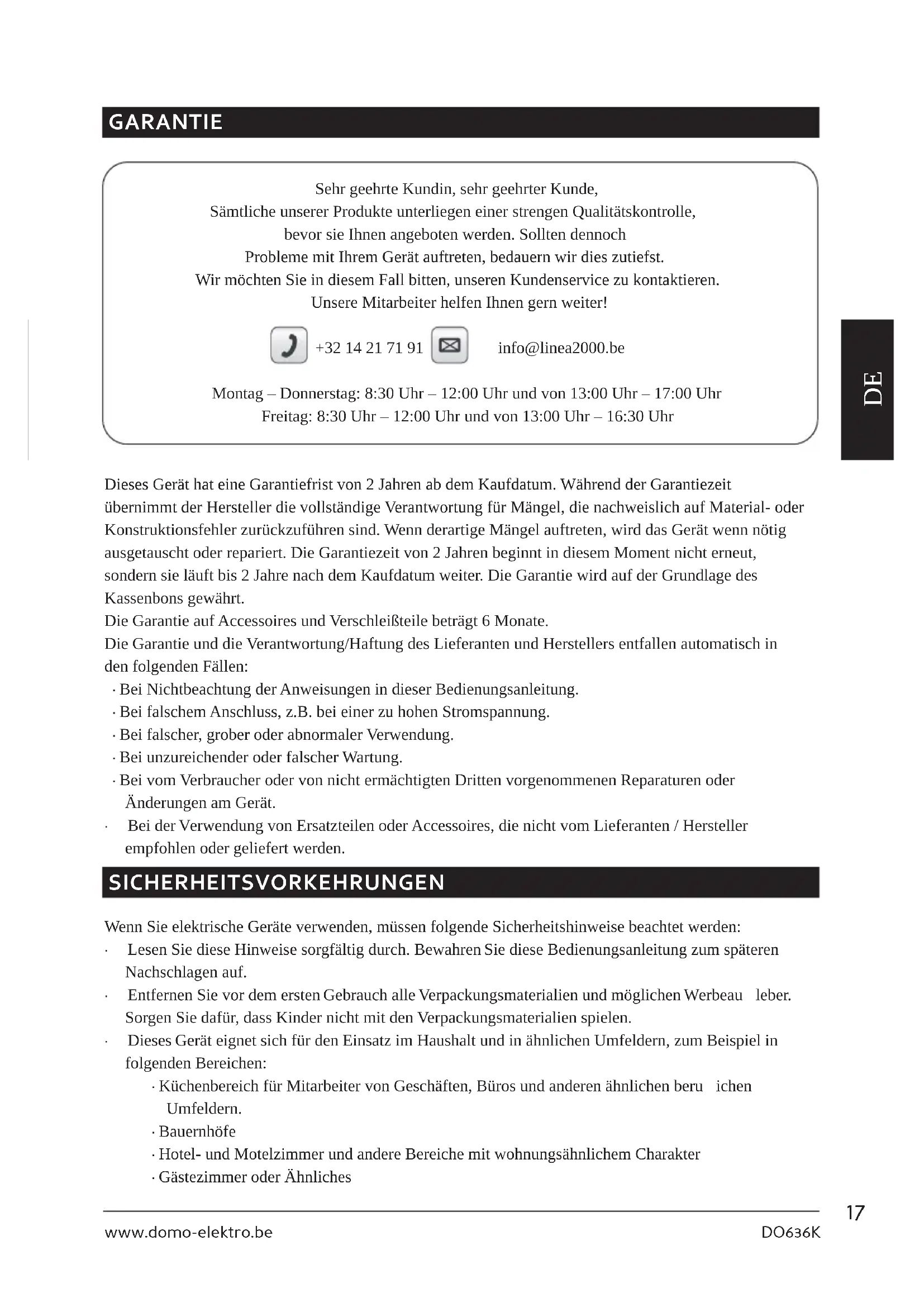 GARANTIE Sehr geehrte Kundin, sehr geehrter Kunde, Sämtliche unserer Produkte unterliegen einer strengen Qualitätskontrolle, bevor sie Ihnen angeboten werden. Sollten dennoch Probleme mit Ihrem Gerät auftreten, bedauern wir dies zutiefst. Wir möchten Sie in diesem Fall bitten, unseren Kundenservice zu kontaktieren. Unsere Mitarbeiter helfen Ihnen gern weiter! +32 14 21 71 91 info@linea2000.be Montag – Donnerstag: 8:30 Uhr – 12:00 Uhr und von 13:00 Uhr – 17:00 Uhr Freitag: 8:30 Uhr – 12:00 Uhr und von 13:00 Uhr – 16:30 Uhr Dieses Gerät hat eine Garantiefrist von 2 Jahren ab dem Kaufdatum. Während der Garantiezeit übernimmt der Hersteller die vollständige Verantwortung für Mängel, die nachweislich auf Material- oder Konstruktionsfehler zurückzuführen sind. Wenn derartige Mängel auftreten, wird das Gerät wenn nötig ausgetauscht oder repariert. Die Garantiezeit von 2 Jahren beginnt in diesem Moment nicht erneut, sondern sie läuft bis 2 Jahre nach dem Kaufdatum weiter. Die Garantie wird auf der Grundlage des Kassenbons gewährt. Die Garantie auf Accessoires und Verschleißteile beträgt 6 Monate. Die Garantie und die Verantwortung/Haftung des Lieferanten und Herstellers entfallen automatisch in den folgenden Fällen: