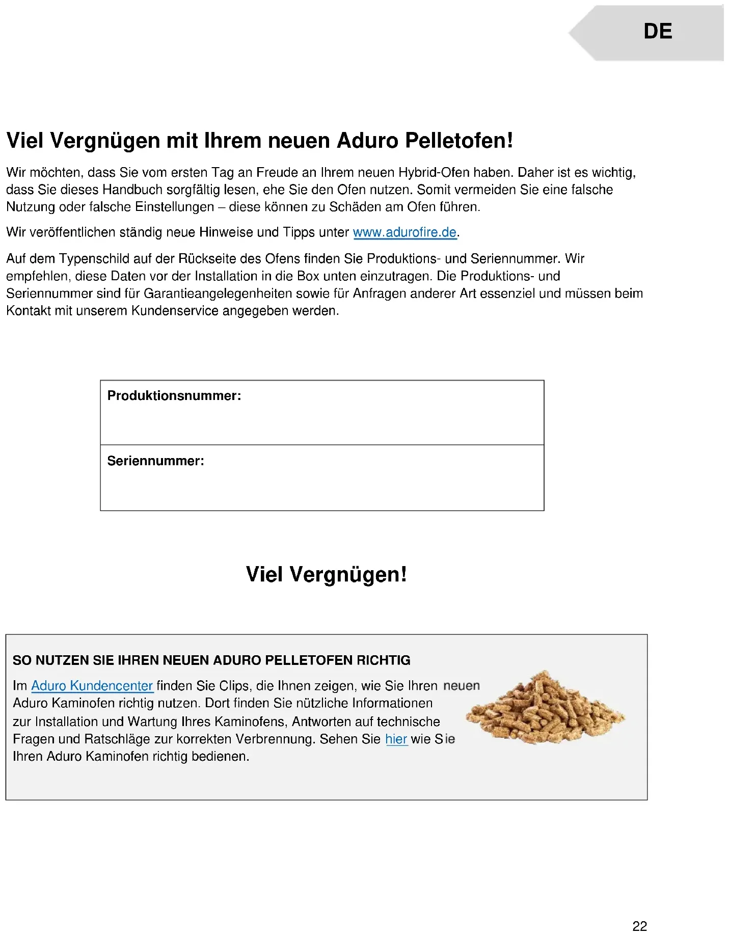 Viel Vergnügen mit Ihrem neuen Aduro Pelletofen! Wir möchten, dass Sie vom ersten Tag an Freude an Ihrem neuen Hybrid-Ofen haben. Daher ist es wichtig, dass Sie dieses Handbuch sorgfältig lesen, ehe Sie den Ofen nutzen. Somit vermeiden Sie eine falsche Nutzung oder falsche Einstellungen – diese können zu Schäden am Ofen führen. Wir veröffentlichen ständig neue Hinweise und Tipps unter www.adurofire.de. Auf dem Typenschild auf der Rückseite des Ofens finden Sie Produktions- und Seriennummer. Wir empfehlen, diese Daten vor der Installation in die Box unten einzutragen. Die Produktions- und Seriennummer sind für Garantieangelegenheiten sowie für Anfragen anderer Art essenziel und müssen beim Kontakt mit unserem Kundenservice angegeben werden.