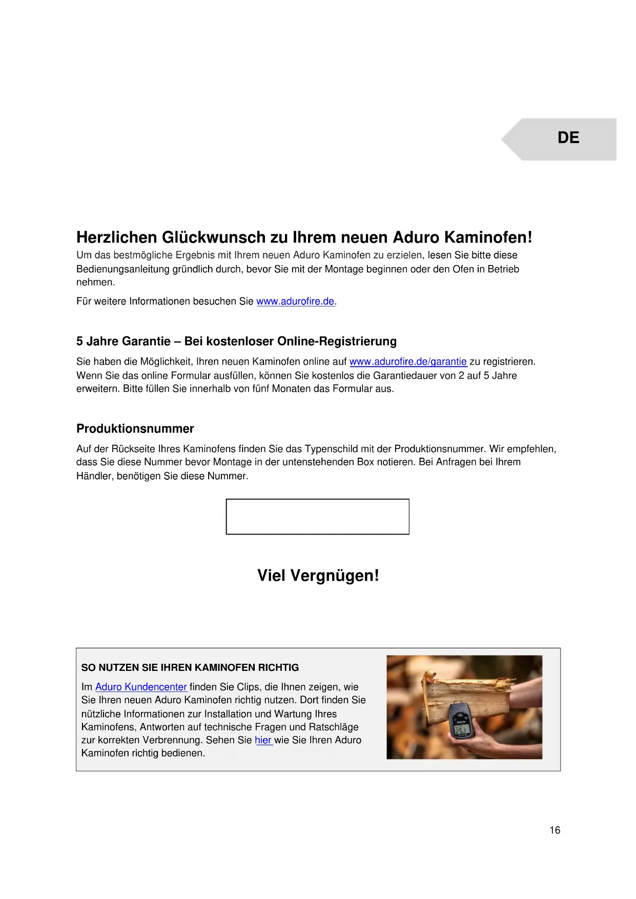 Herzlichen Glückwunsch zu Ihrem neuen Aduro Kaminofen! Um das bestmögliche Ergebnis mit Ihrem neuen Aduro Kaminofen zu erzielen, lesen Sie bitte diese Bedienungsanleitung gründlich durch, bevor Sie mit der Montage beginnen oder den Ofen in Betrieb nehmen. Für weitere Informationen besuchen Sie www.adurofire.de. 5 Jahre Garantie – Bei kostenloser Online-Registrierung Sie haben die Möglichkeit, Ihren neuen Kaminofen online auf www.adurofire.de/garantie zu registrieren. Wenn Sie das online Formular ausfüllen, können Sie kostenlos die Garantiedauer von 2 auf 5 Jahre erweitern. Bitte füllen Sie innerhalb von fünf Monaten das Formular aus. Produktionsnummer Auf der Rückseite Ihres Kaminofens finden Sie das Typenschild mit der Produktionsnummer. Wir empfehlen, dass Sie diese Nummer bevor Montage in der untenstehenden Box notieren. Bei Anfragen bei Ihrem Händler, benötigen Sie diese Nummer.