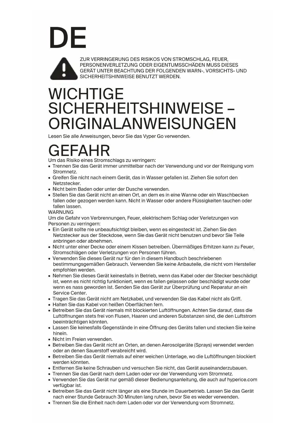 GERÄT UNTER BEACHTUNG DER FOLGENDEN WARN-, VORSICHTS- UND SICHERHEITSHINWEISE BENUTZT WERDEN. WICHTIGE SICHERHEITSHINWEISE – ORIGINALANWEISUNGEN Lesen Sie alle Anweisungen, bevor Sie das VyperGo verwenden. GEFAHR Um das Risiko eines Stromschlags zu verringern: