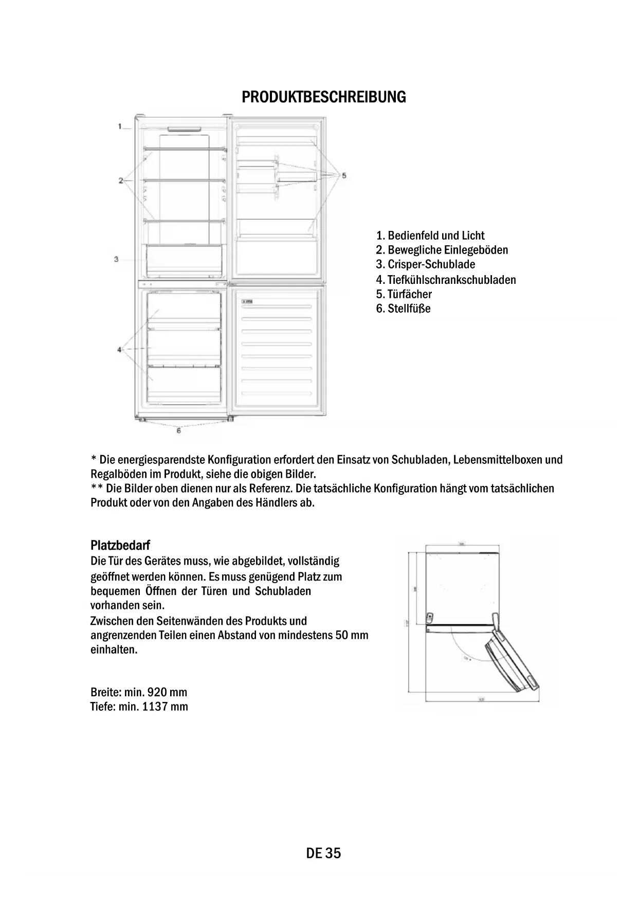 - Die energiesparendste Konfiguration erfordert den Einsatz von Schubladen, Lebensmittelboxen und Regalböden im Produkt, siehe die obigen Bilder. ** Die Bilder oben dienen nur als Referenz. Die tatsächliche Konfiguration hängt vom tatsächlichen Produkt oder von den Angaben des Händlers ab. Platzbedarf Die Tür des Gerätes muss, wie abgebildet, vollständig geöffnet werden können. Es muss genügend Platz zum bequemen Öffnen der Türen und Schubladen vorhanden sein. Zwischen den Seitenwänden des Produkts und angrenzenden Teilen einen Abstand von mindestens 50 mm einhalten. Breite: min. 920 mm Tiefe: min. 1137 mmDE 36 NUTZUNG ➀ Die ON/OFF-Taste dient zum Ein- und Ausschalten des Geräts. ➁ Die SET-Taste dient zur Auswahl der Kühlschranktemperatur oder der Sonderfunktionen. ➂ Das Wi-Fi-Symbol zeigt an, ob das Gerät mit der App verbunden ist. ➃ Das Super Cool-Symbol zeigt an, ob die Funktion aktiviert ist. ➄ Die Temperaturstufen zeigen die ausgewählte Temperatur an. Nutzung