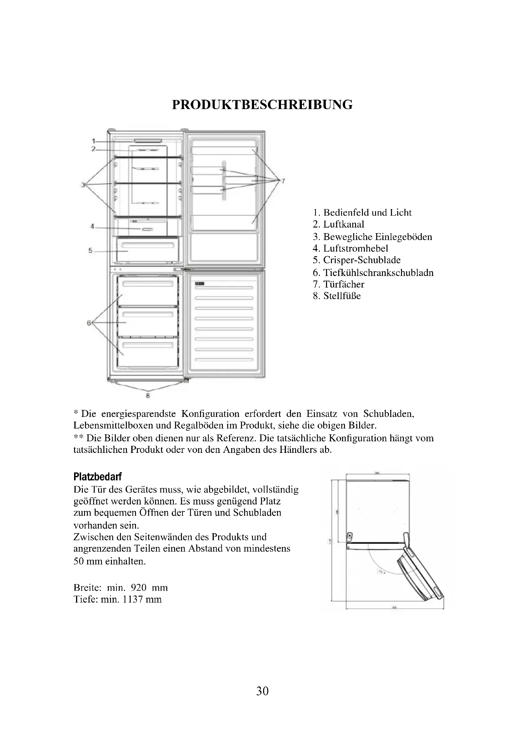 - Die energiesparendste Konfiguration erfordert den Einsatz von Schubladen, Lebensmittelboxen und Regalböden im Produkt, siehe die obigen Bilder. ** Die Bilder oben dienen nur als Referenz. Die tatsächliche Konfiguration hängt vom tatsächlichen Produkt oder von den Angaben des Händlers ab. Platzbedarf Die Tür des Gerätes muss, wie abgebildet, vollständig geöffnet werden können. Es muss genügend Platz zum bequemen Öffnen der Türen und Schubladen vorhanden sein. Zwischen den Seitenwänden des Produkts und angrenzenden Teilen einen Abstand von mindestens 50 mm einhalten. Breite: min. 920 mm Tiefe: min. 1137 mm31 Nutzung